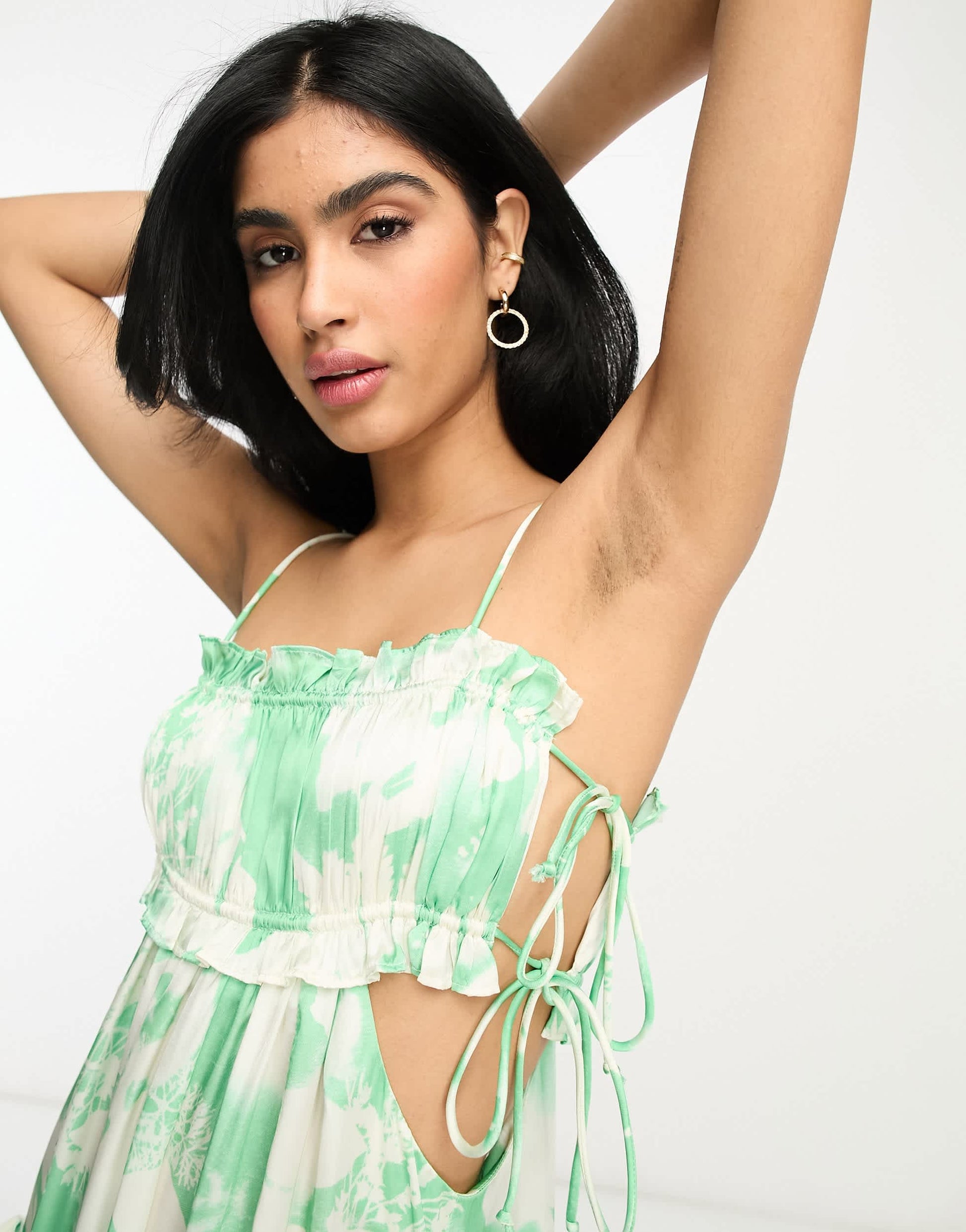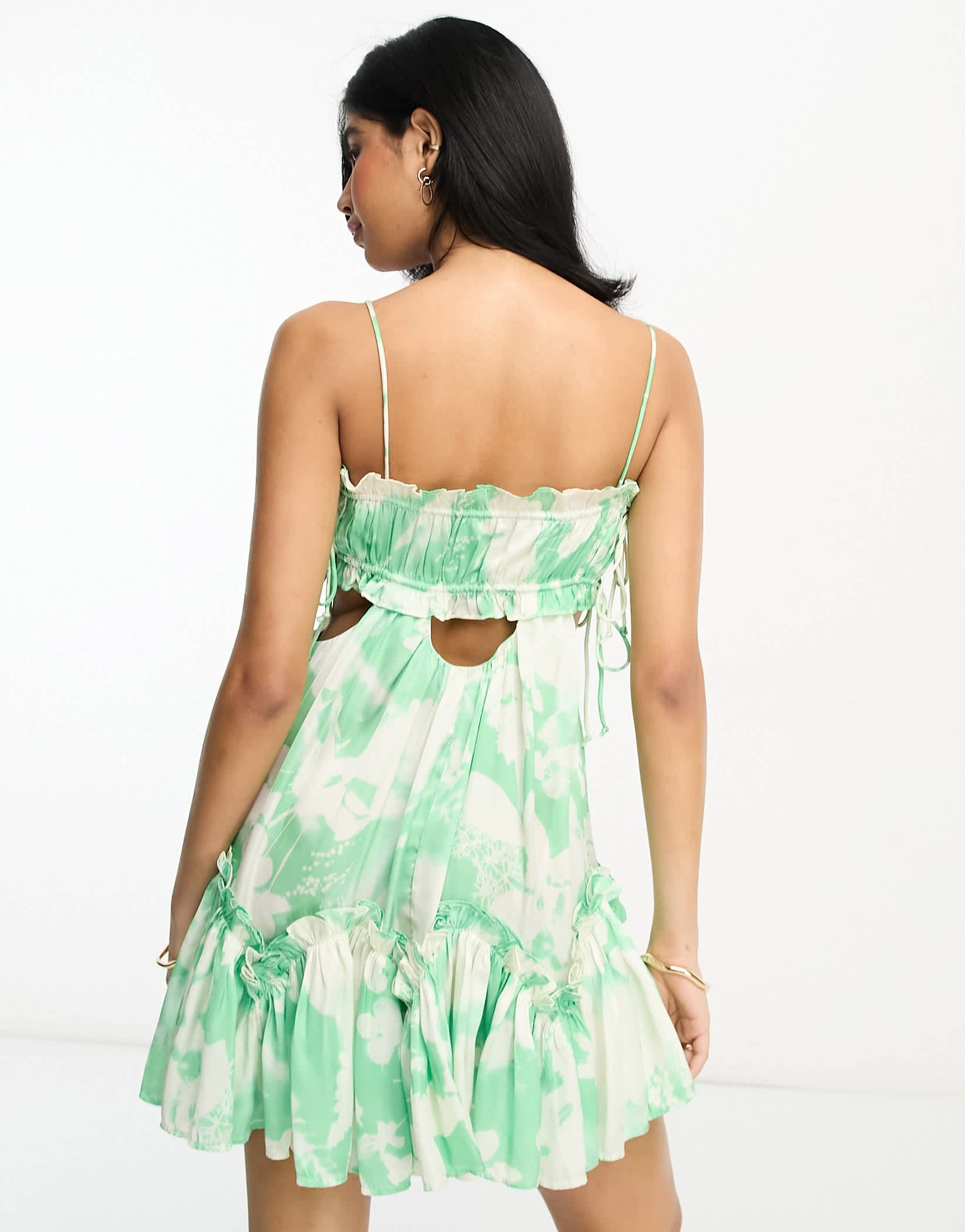 ASOS DESIGN ruched bust mini dress with tie detail and cut out in green floral print