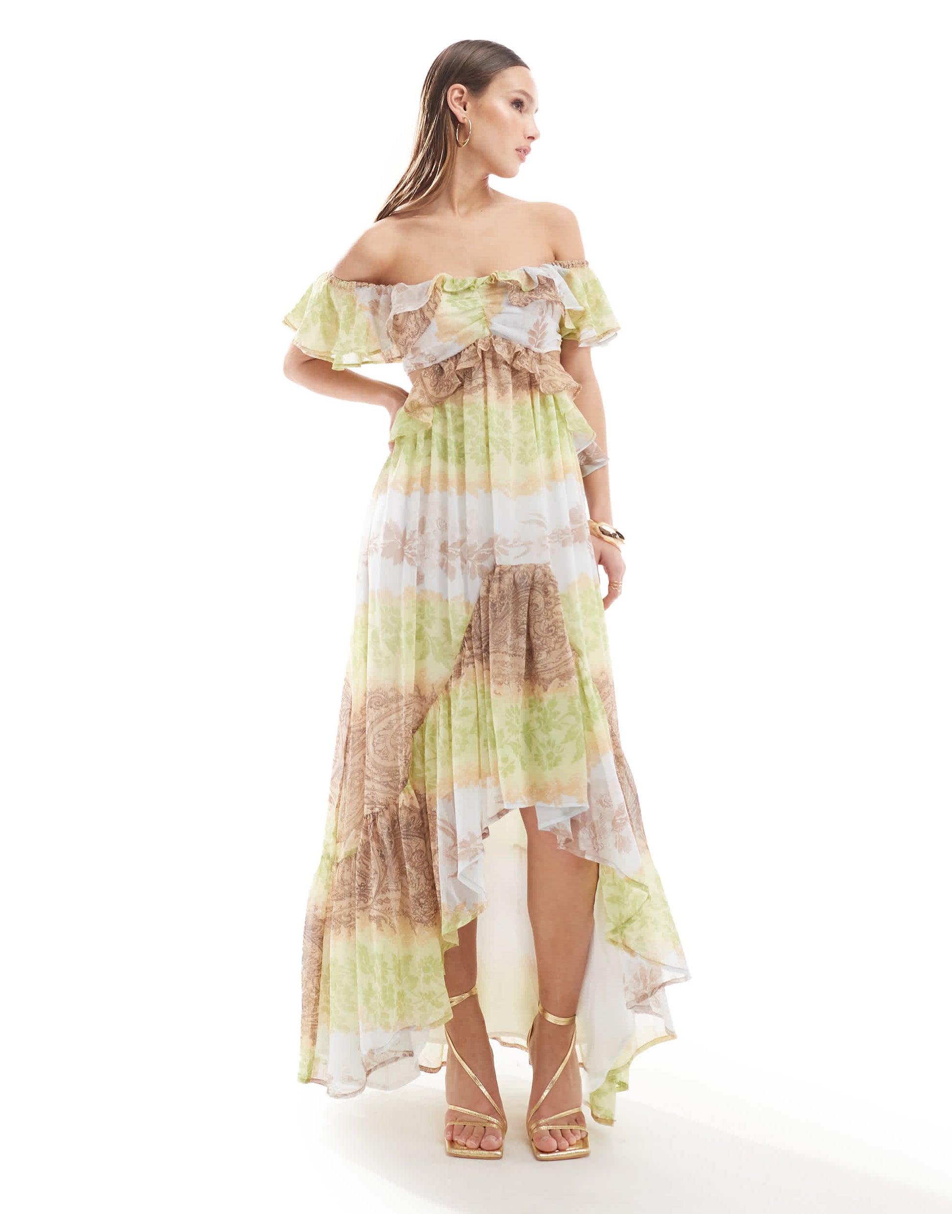 ASOS DESIGN ruffle cut out off the shoulder maxi dress with hi low hem in mixed vintage floral