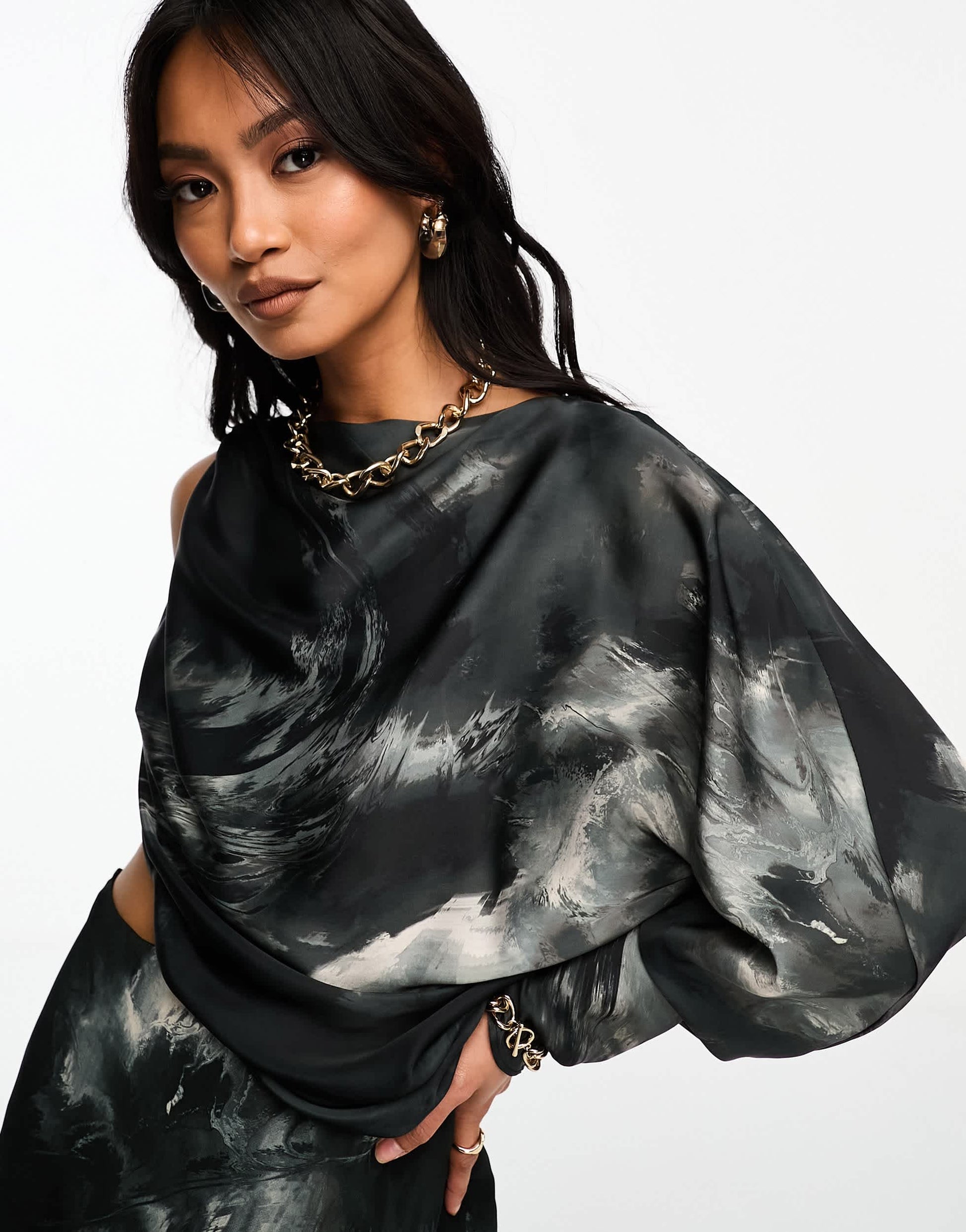 ASOS DESIGN satin draped one shoulder maxi dress with chiffon bias skirt in mono blurred print