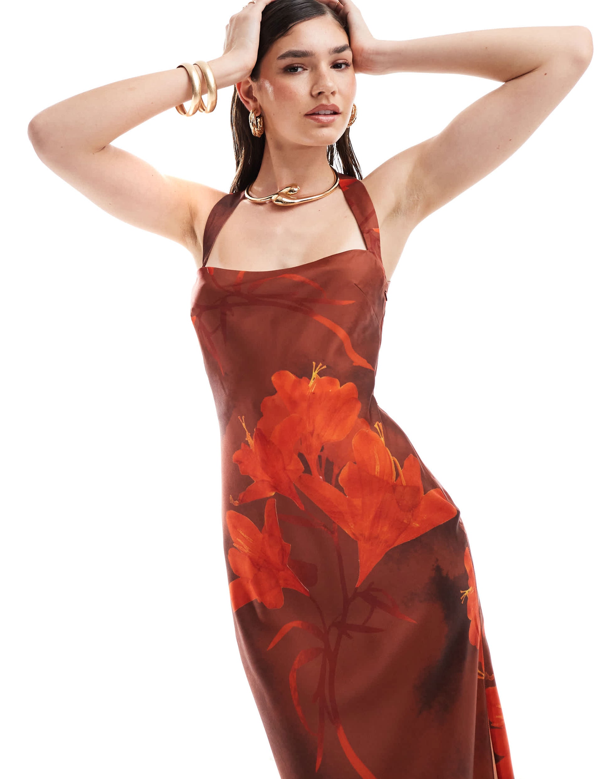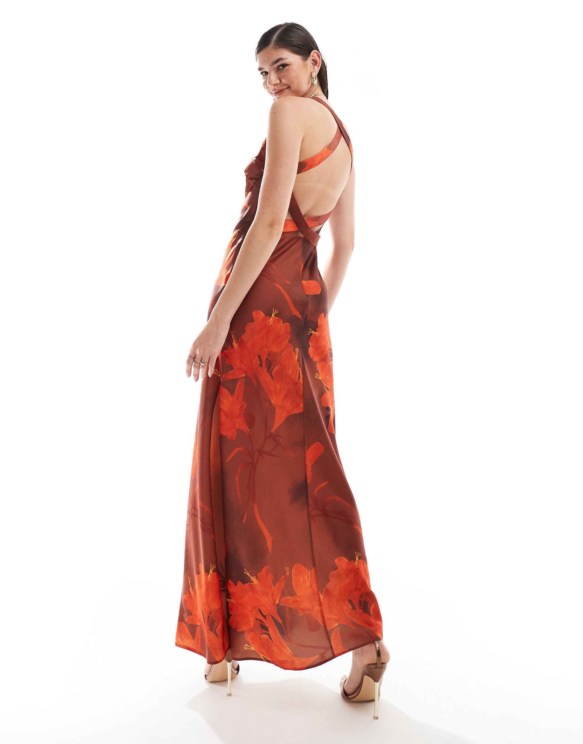 ASOS DESIGN satin wide neck cross back strap maxi dress in rust floral print