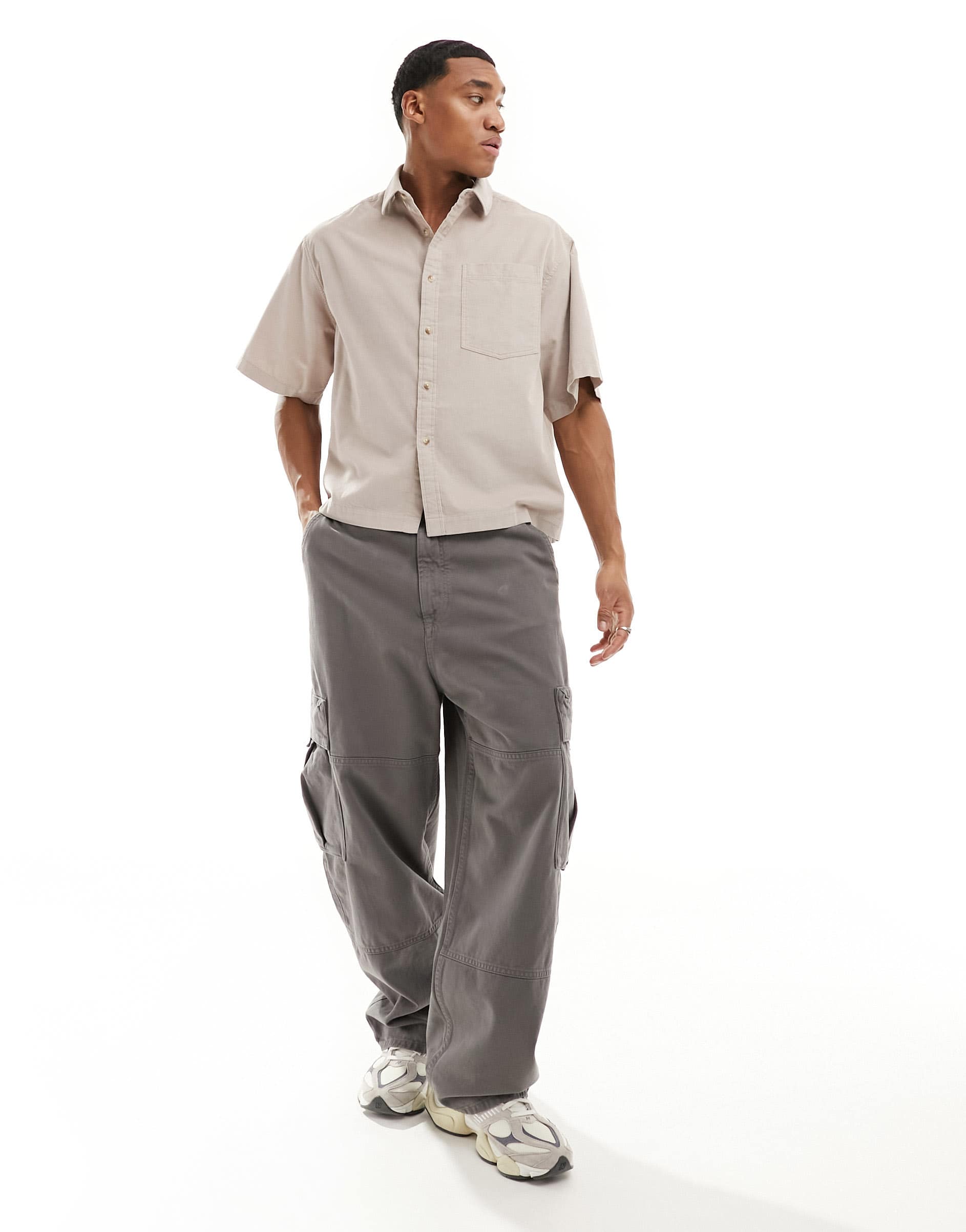 ASOS DESIGN short sleeve boxy oversized cropped shirt in cord in stone