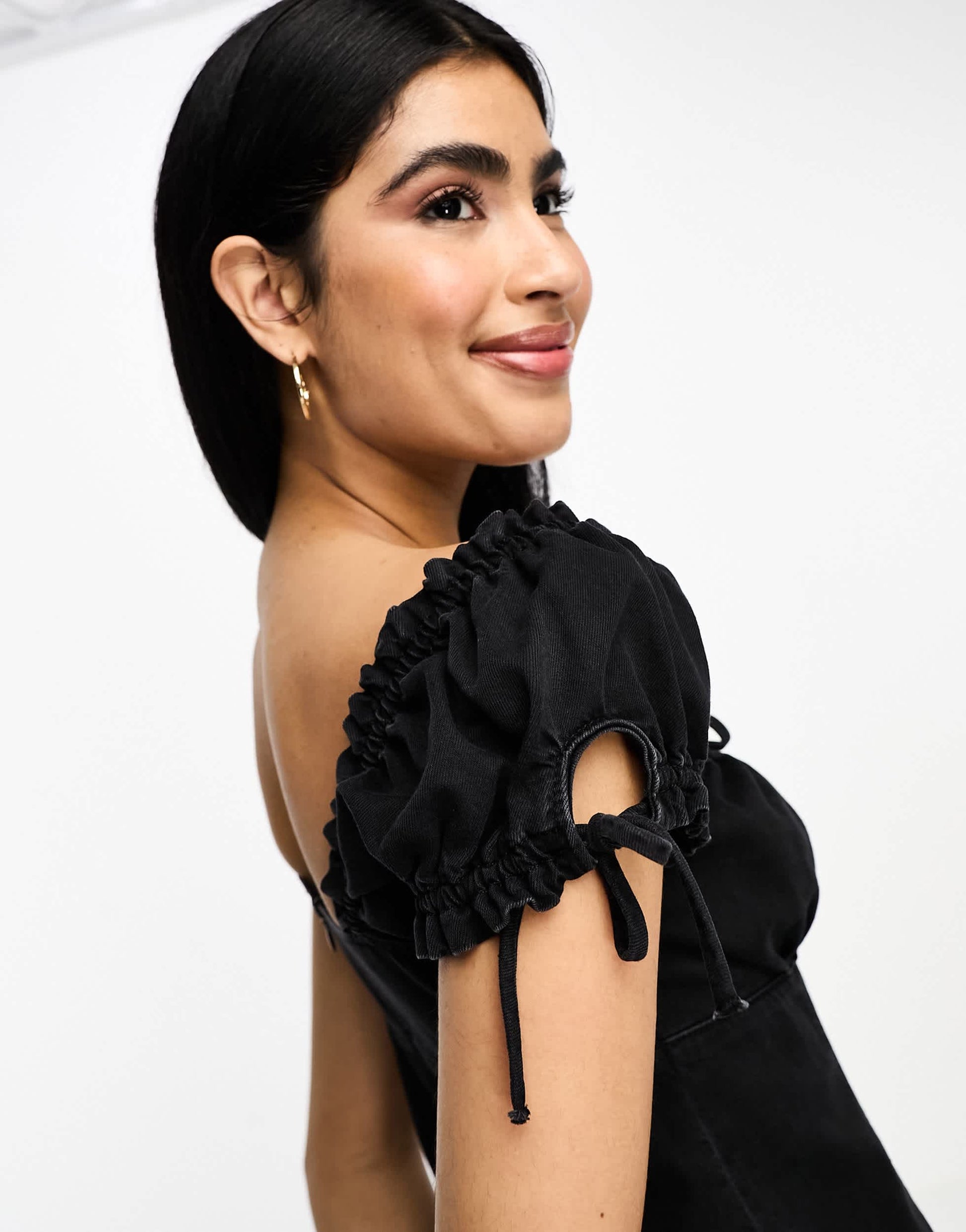 ASOS DESIGN soft denim mini dress with ruched sleeves in black