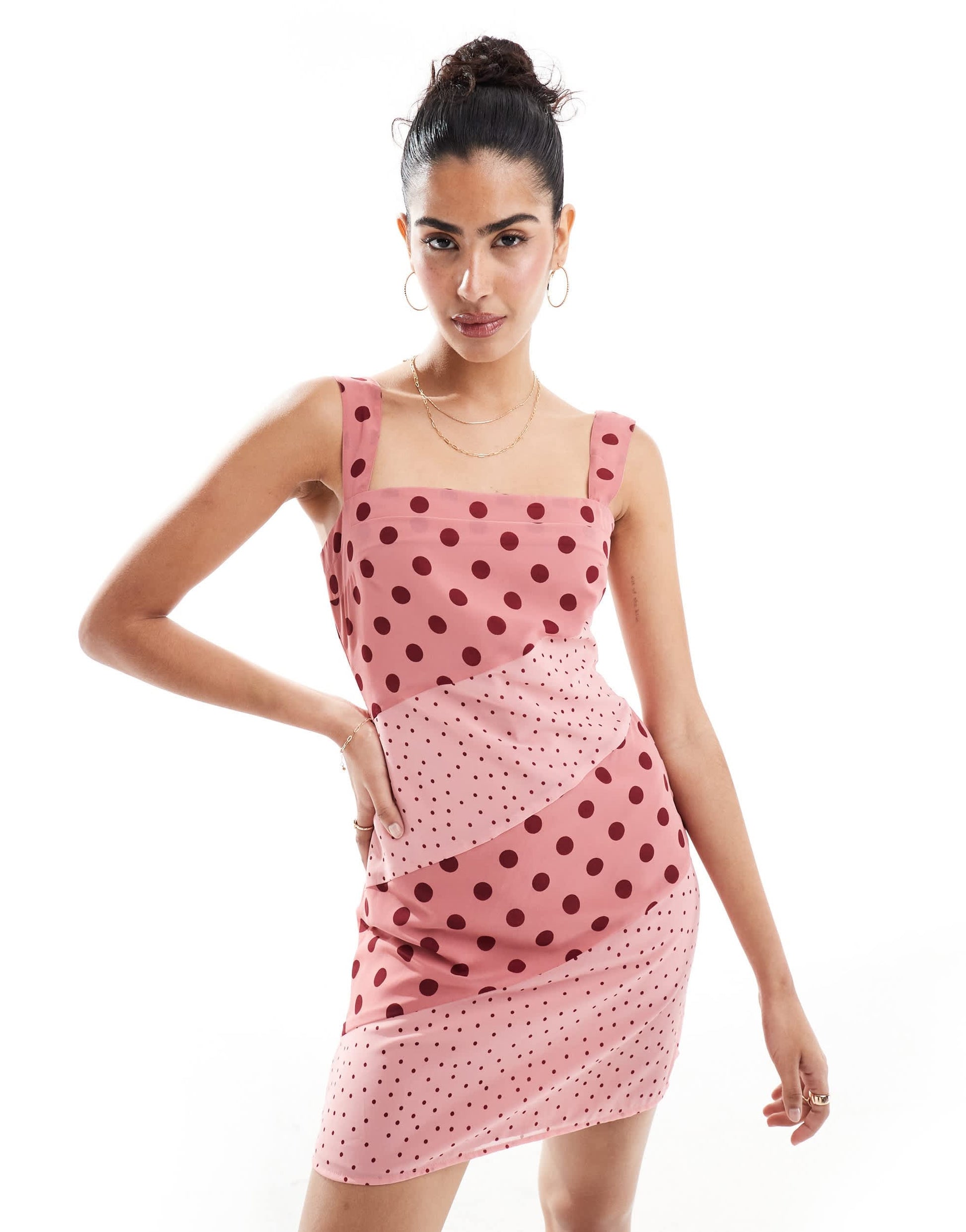 ASOS DESIGN square neck pleated chiffon mini dress in pink spot print