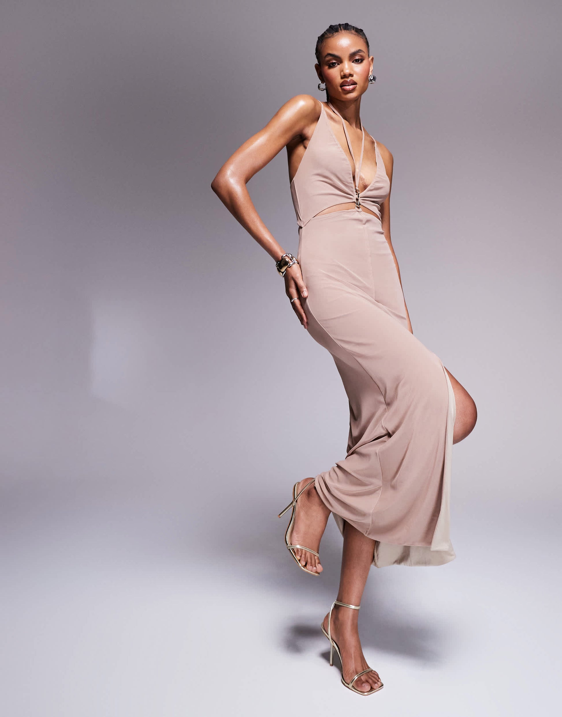 ASOS DESIGN strapping detail plunge maxi dress with gold trim detail in mocha