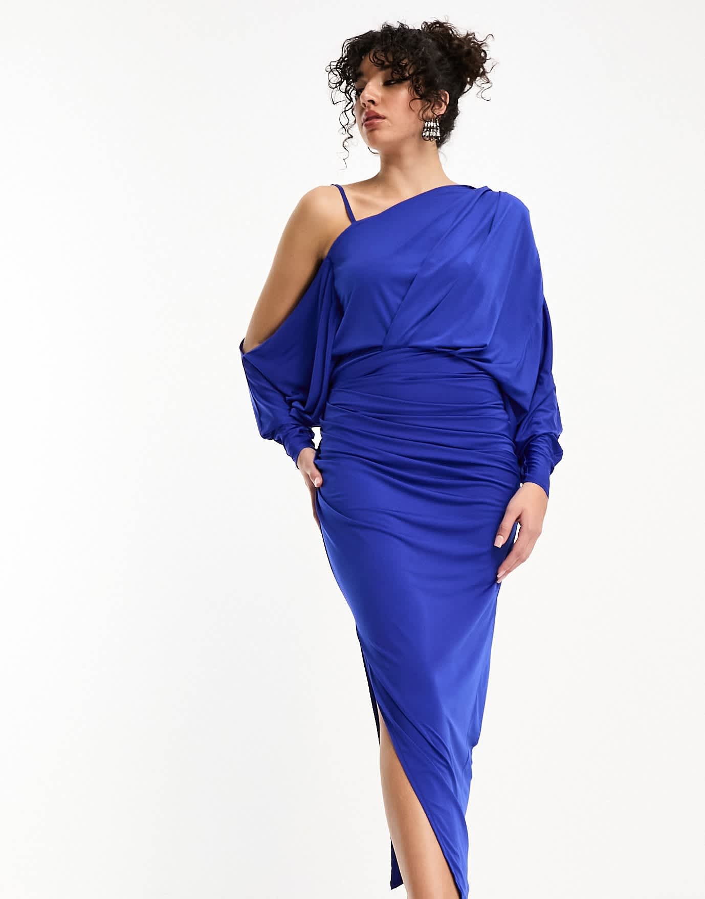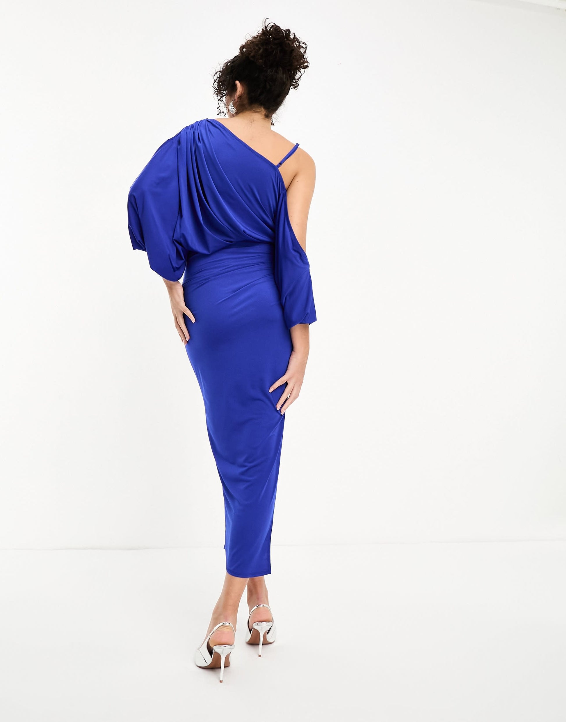 ASOS DESIGN Tall off shoulder grecian drape midi dress in cobalt blue