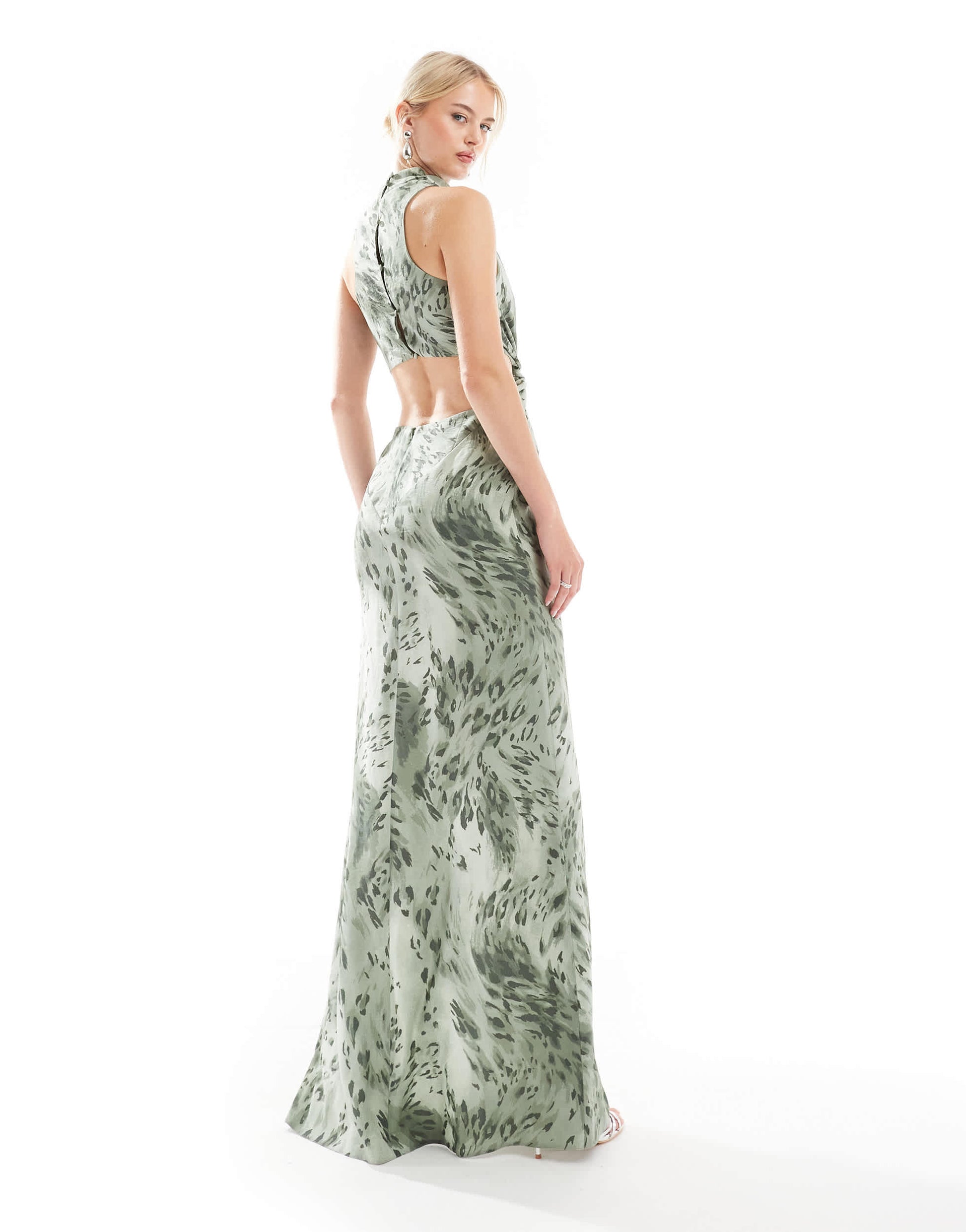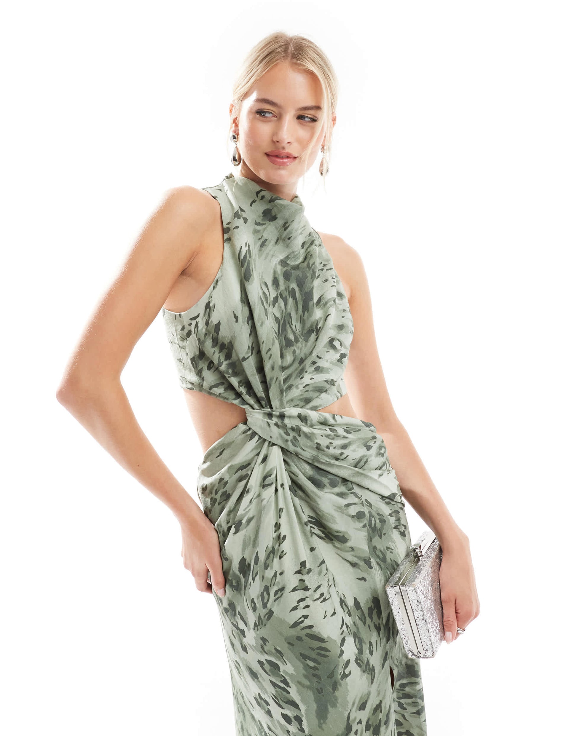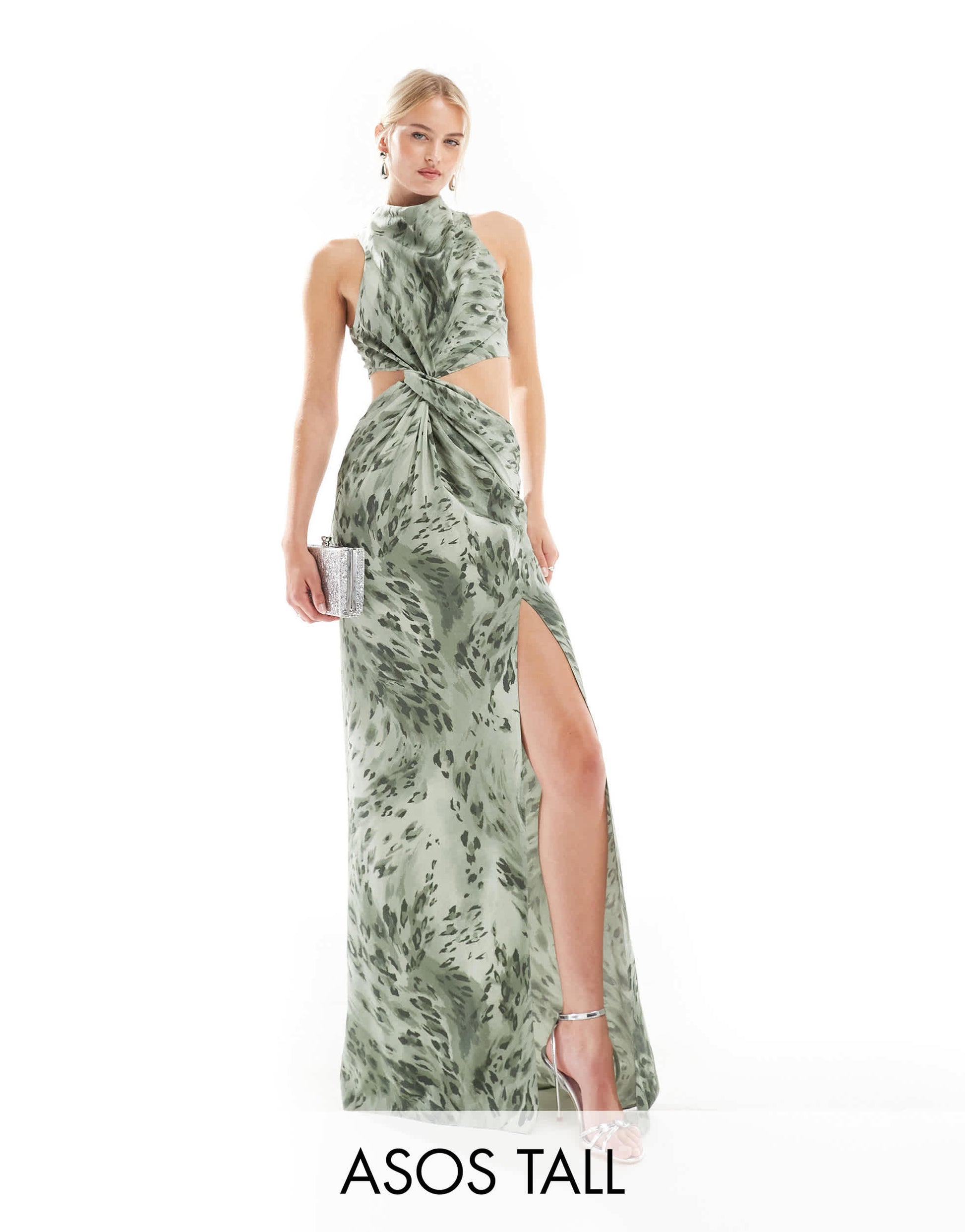 ASOS DESIGN Tall racer neck maxi dress with twist waist detail in abstract leopard print