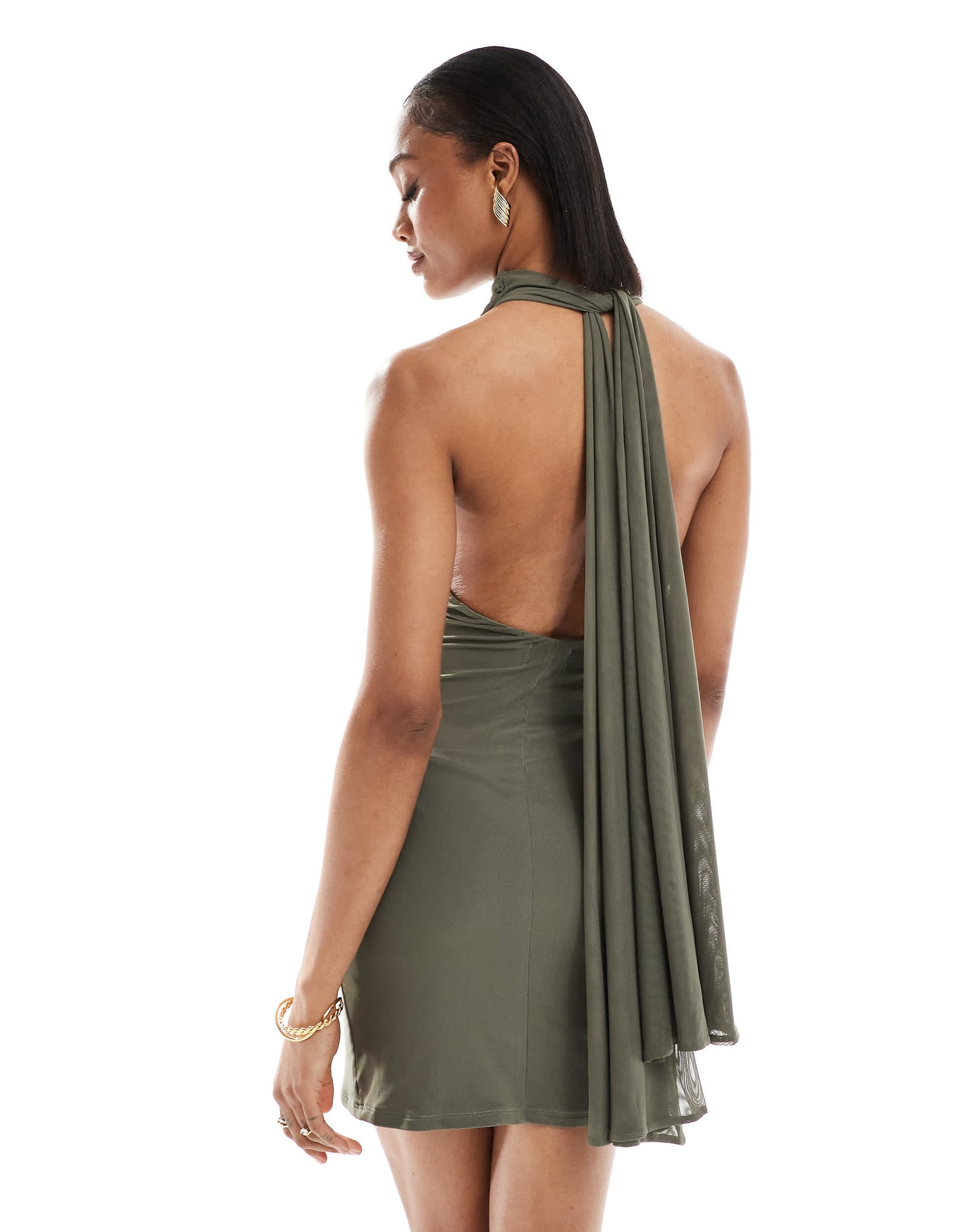 ASOS DESIGN Tall twist bust detail halter mini dress with tie back neck in khaki
