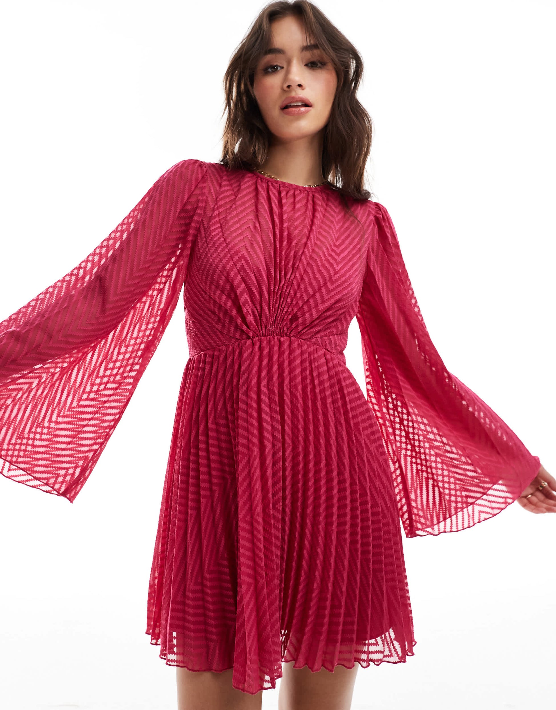 ASOS DESIGN tie back fluted sleeve pleated chevron chiffon mini dress in red