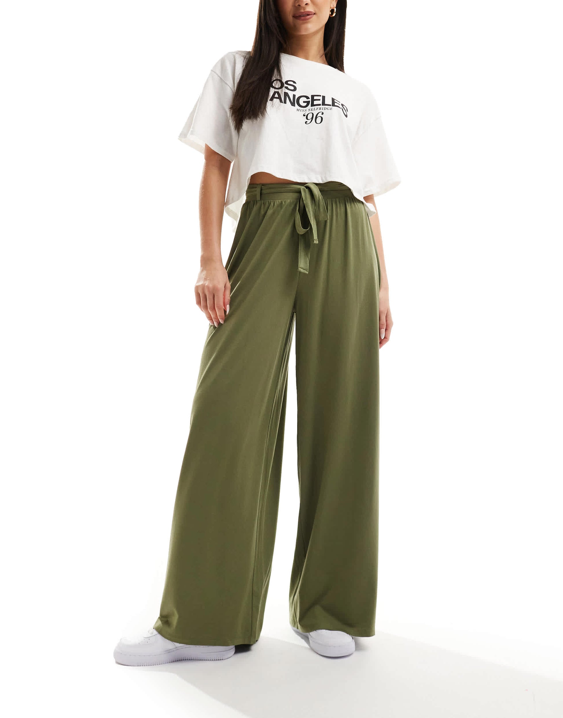 ASOS DESIGN tie belt wide leg trouser in khaki