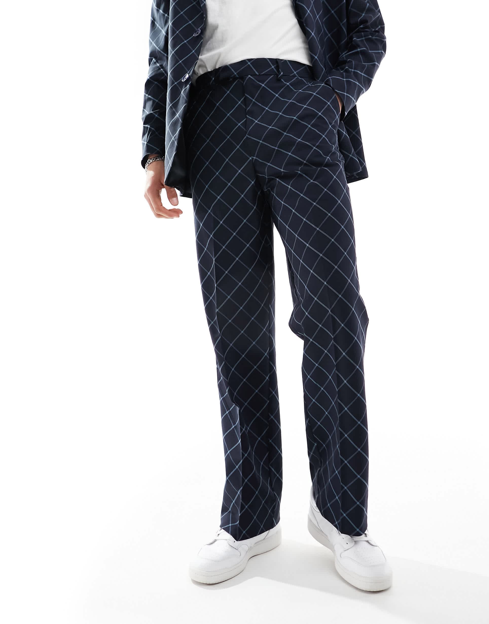 ASOS DESIGN wide leg bias cut check suit trouser in navy windowpane