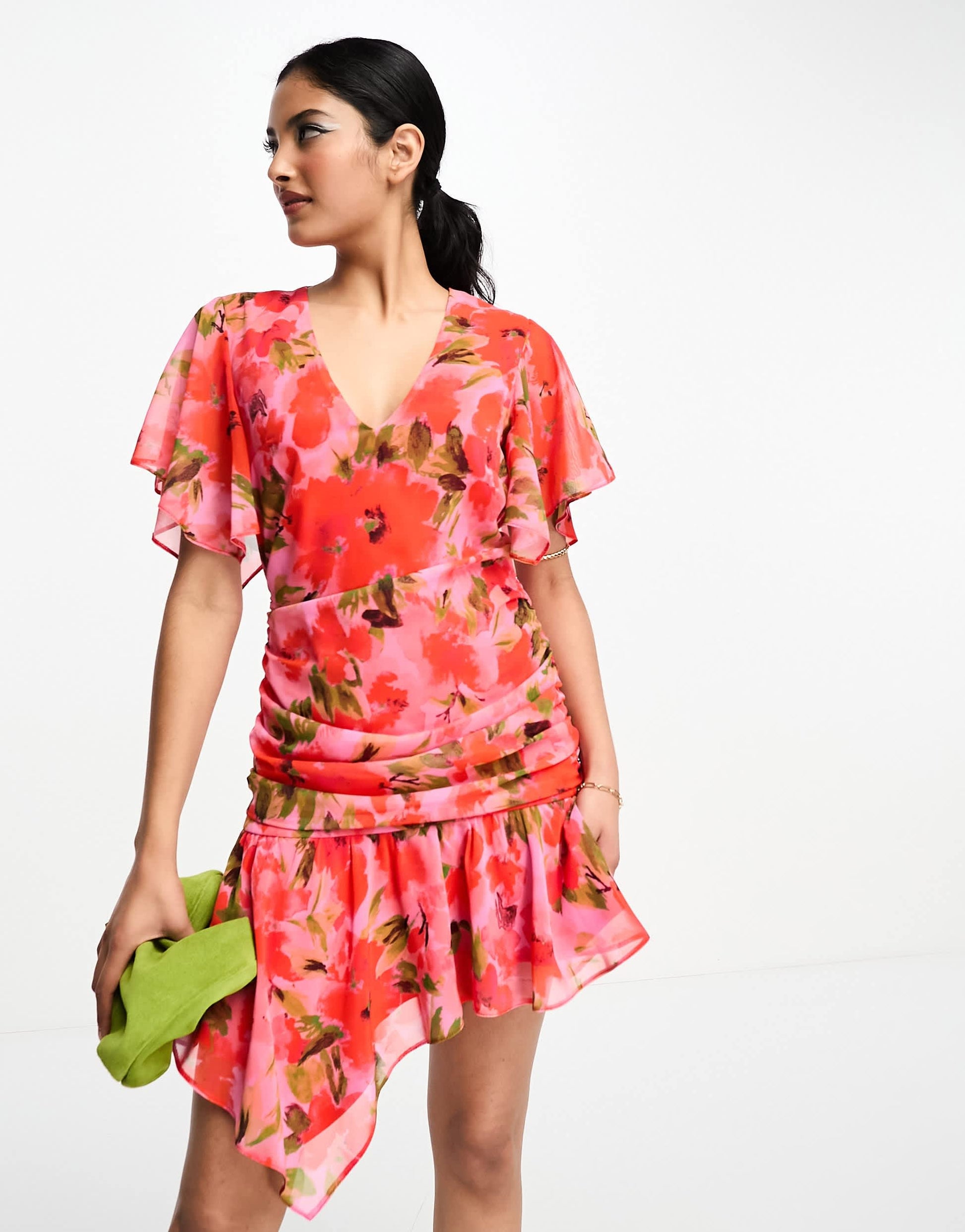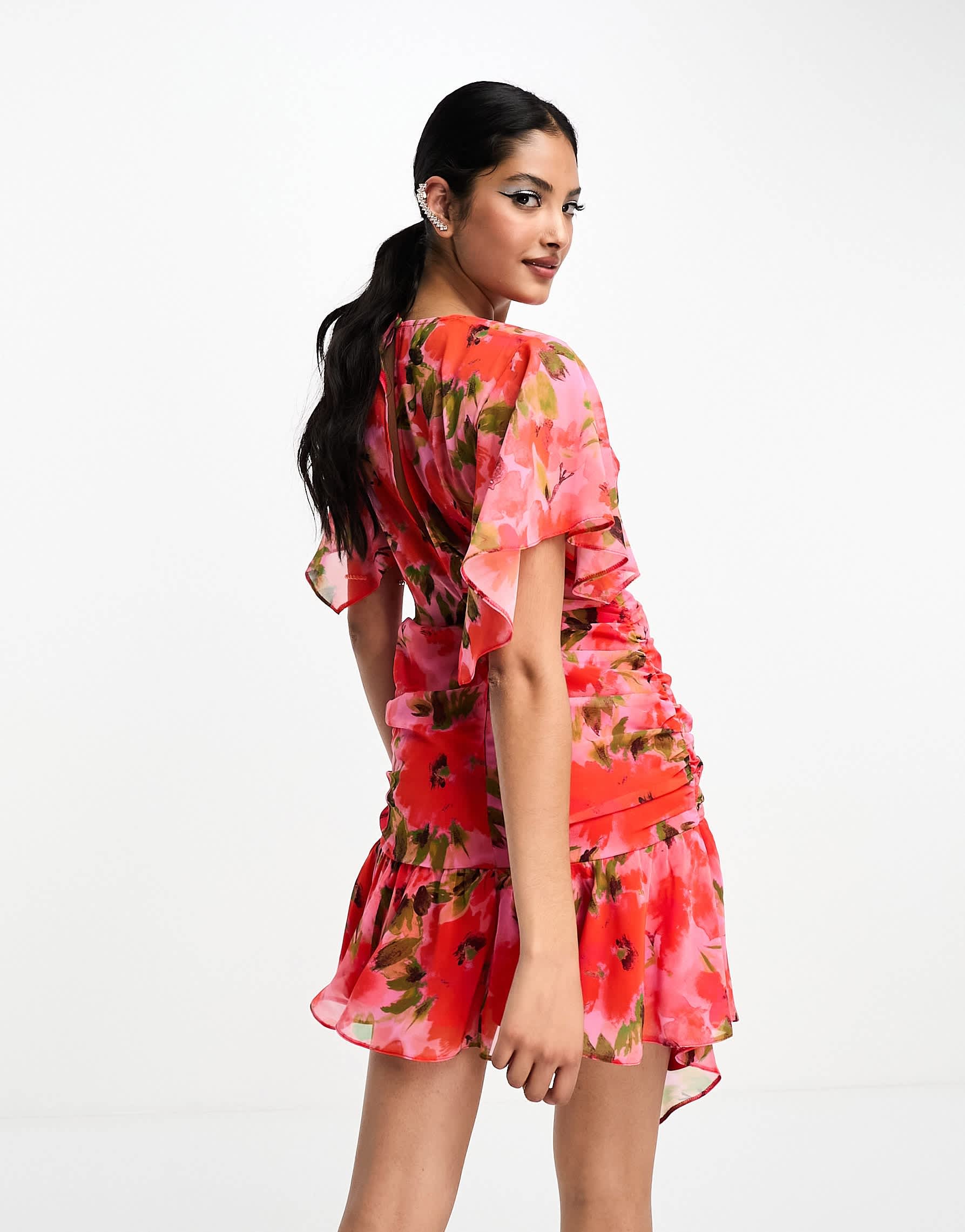 ASOS DESIGN wrap front chiffon mini dress with ruched side and peplum hem in pink floral