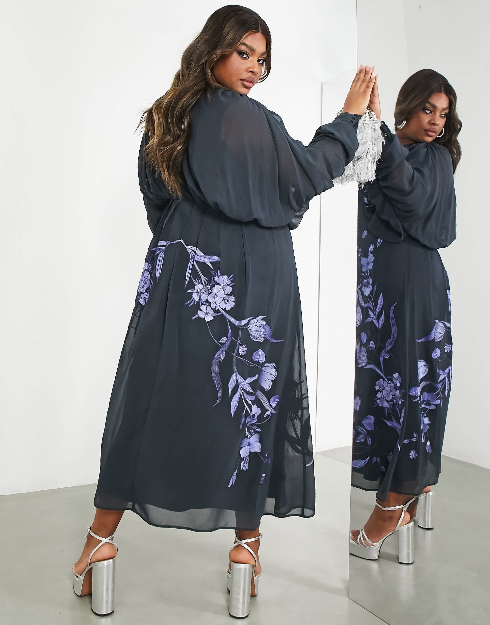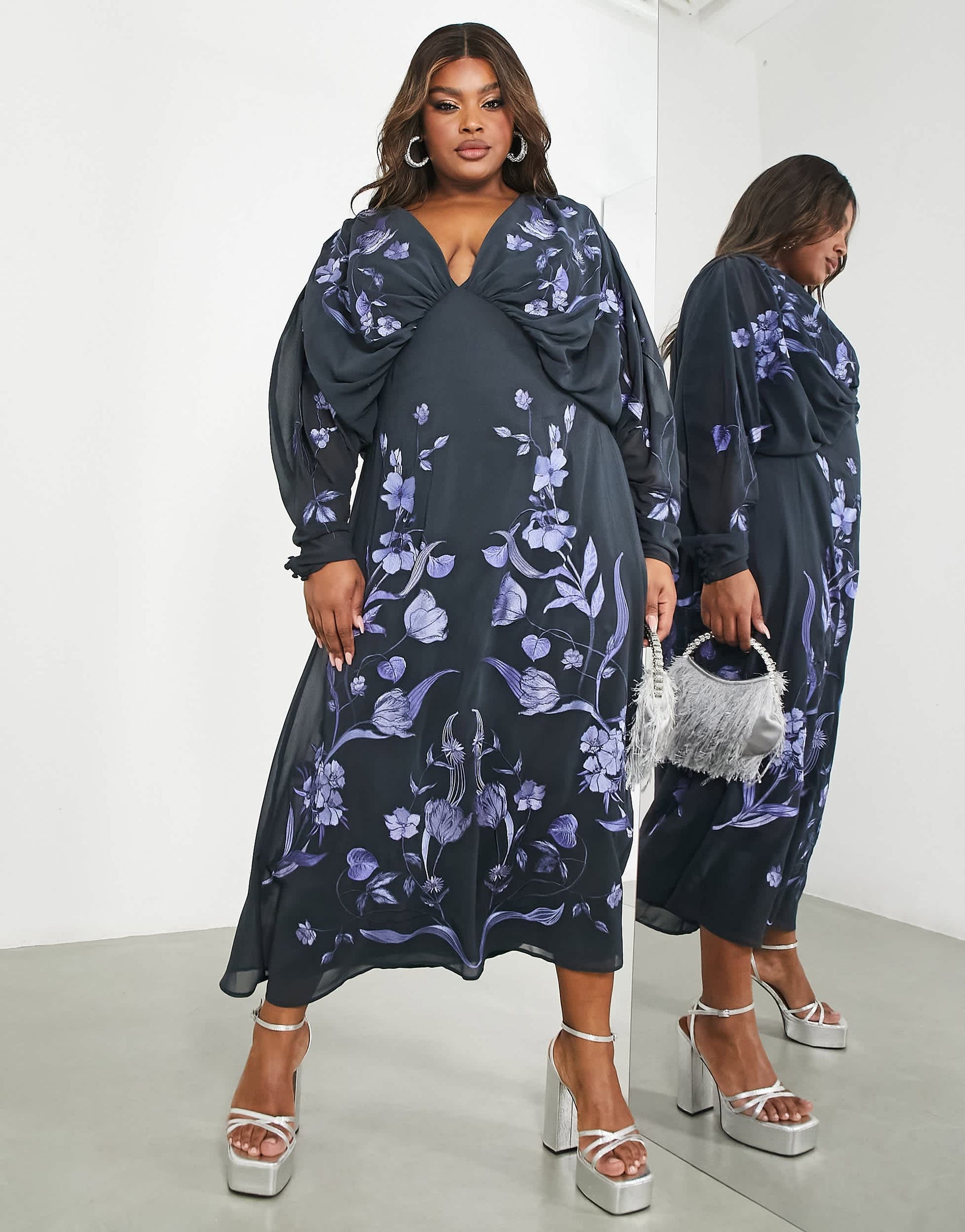 ASOS EDITION Curve batwing chiffon midi dress with floral embroidery in petrol blue