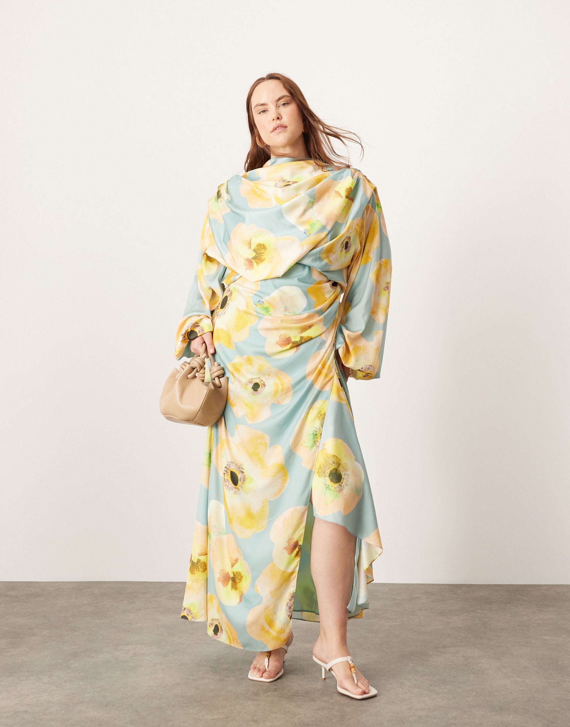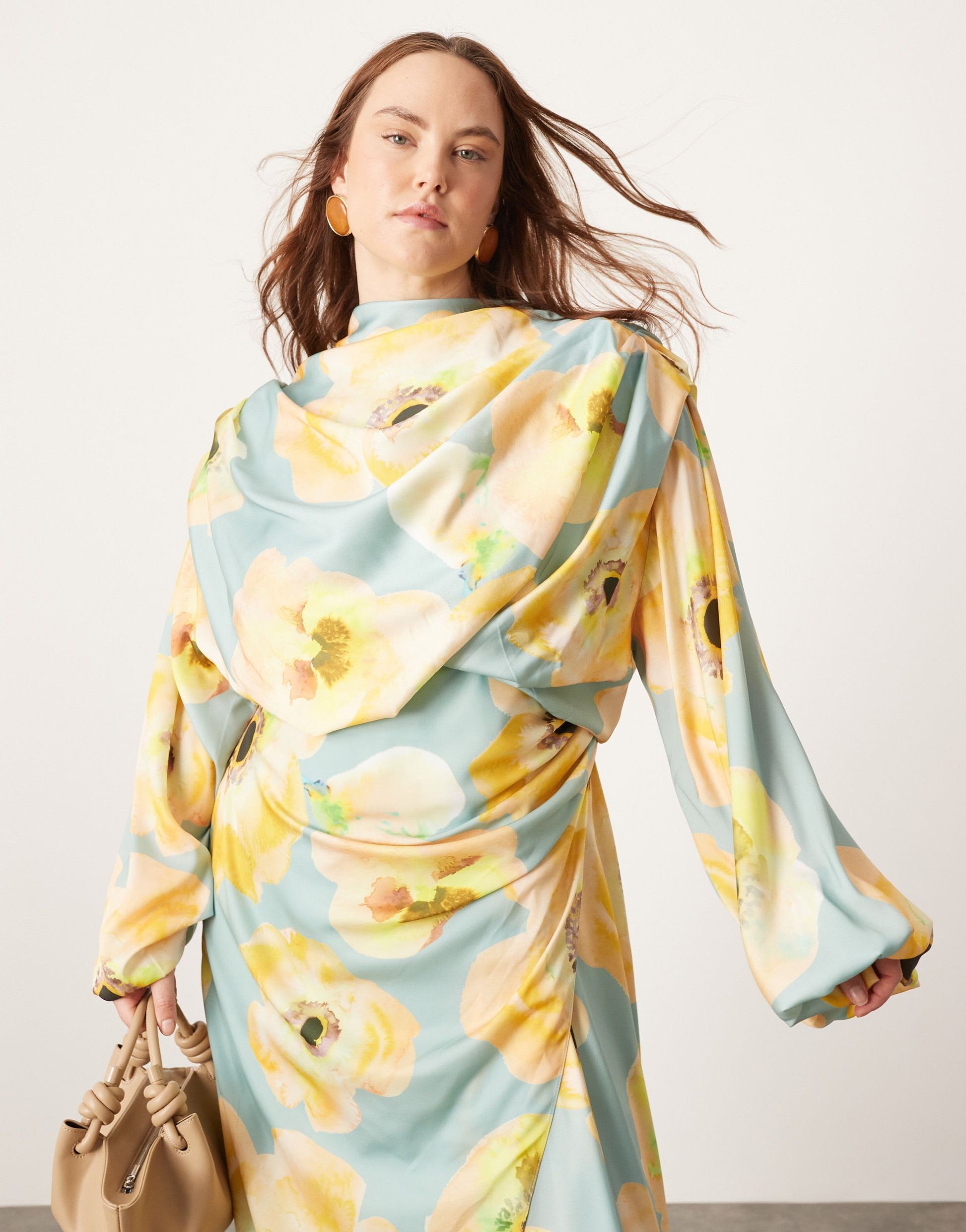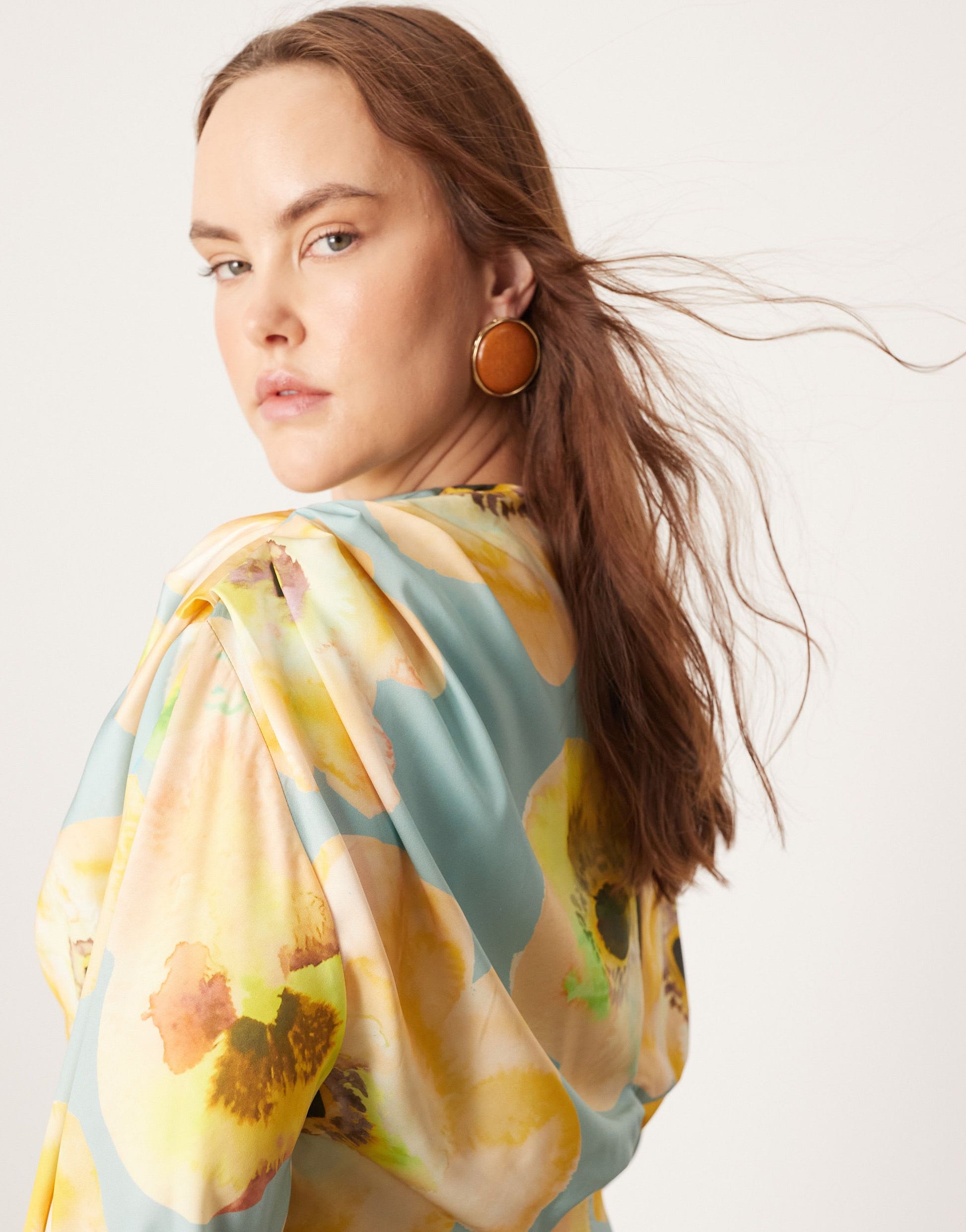 ASOS EDITION Curve satin volume blouson sleeve satin midi dress in large floral print