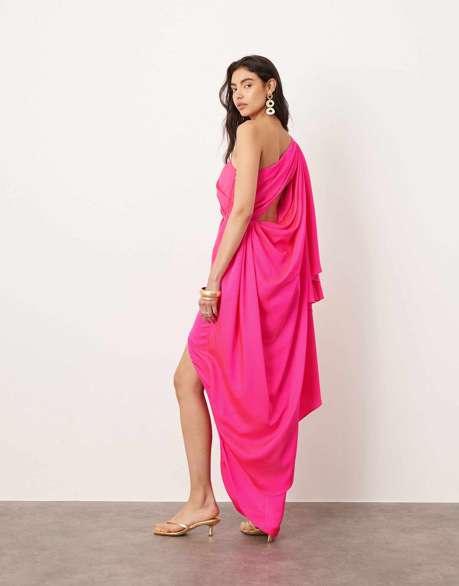 ASOS EDITION satin one shoulder flare sleeve maxi dress with ruched waist detail in pink