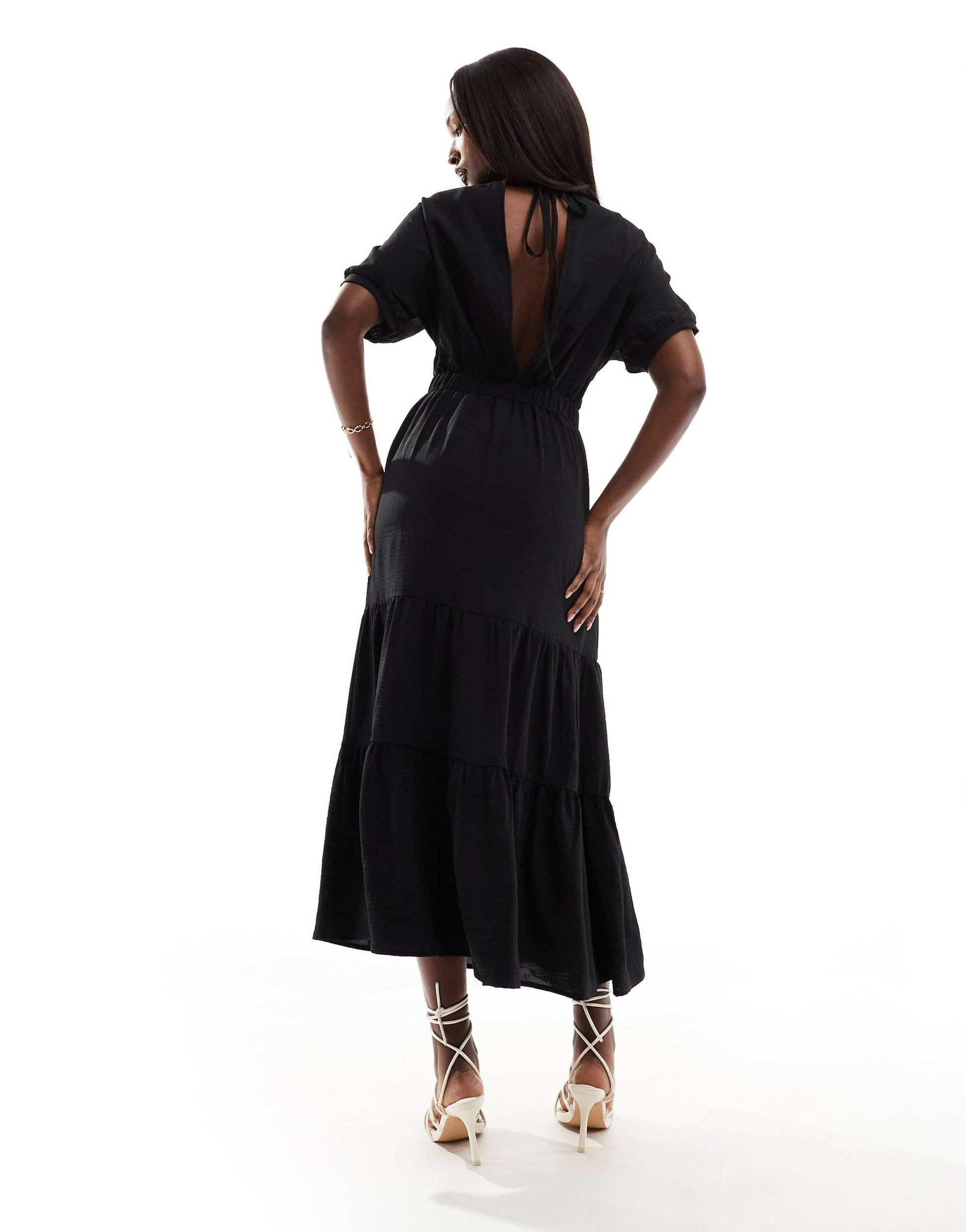 AX Paris poplin puff sleeve tiered hem tie back midaxi dress in black