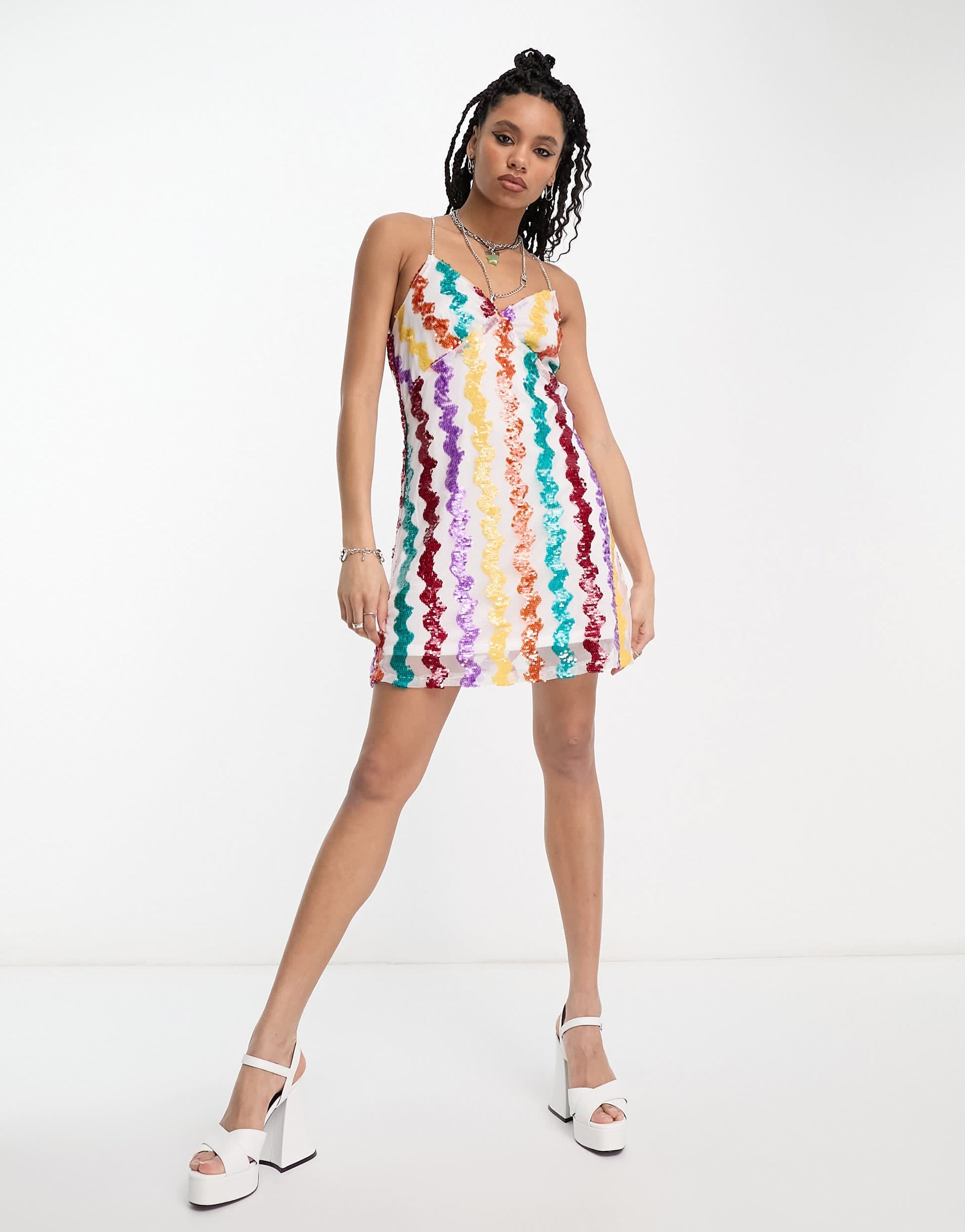 Extro & Vert Premium cami mini dress in rainbow swirl sequin with diamante straps