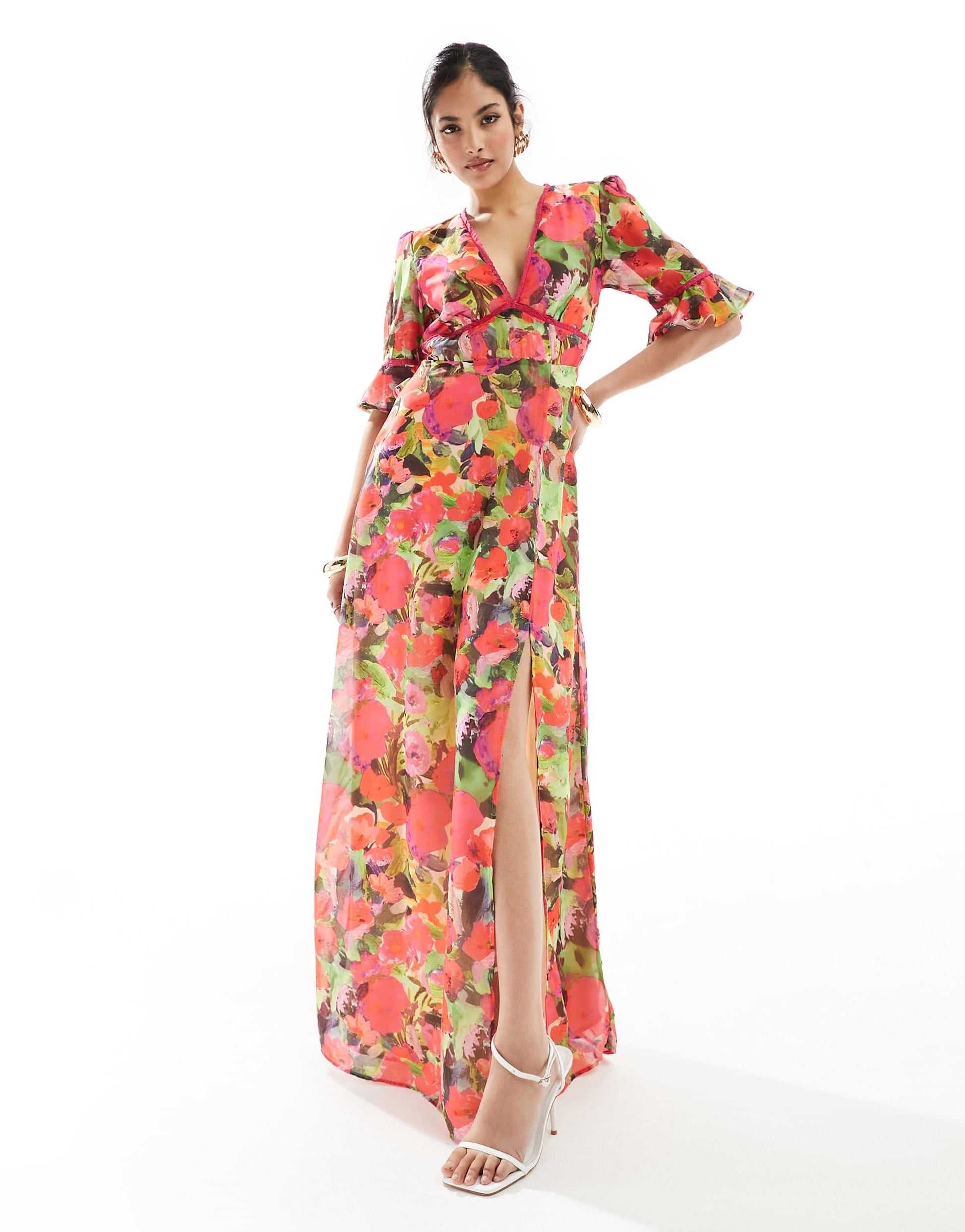 Hope & Ivy plunge maxi dress with fluted sleeves in red floral