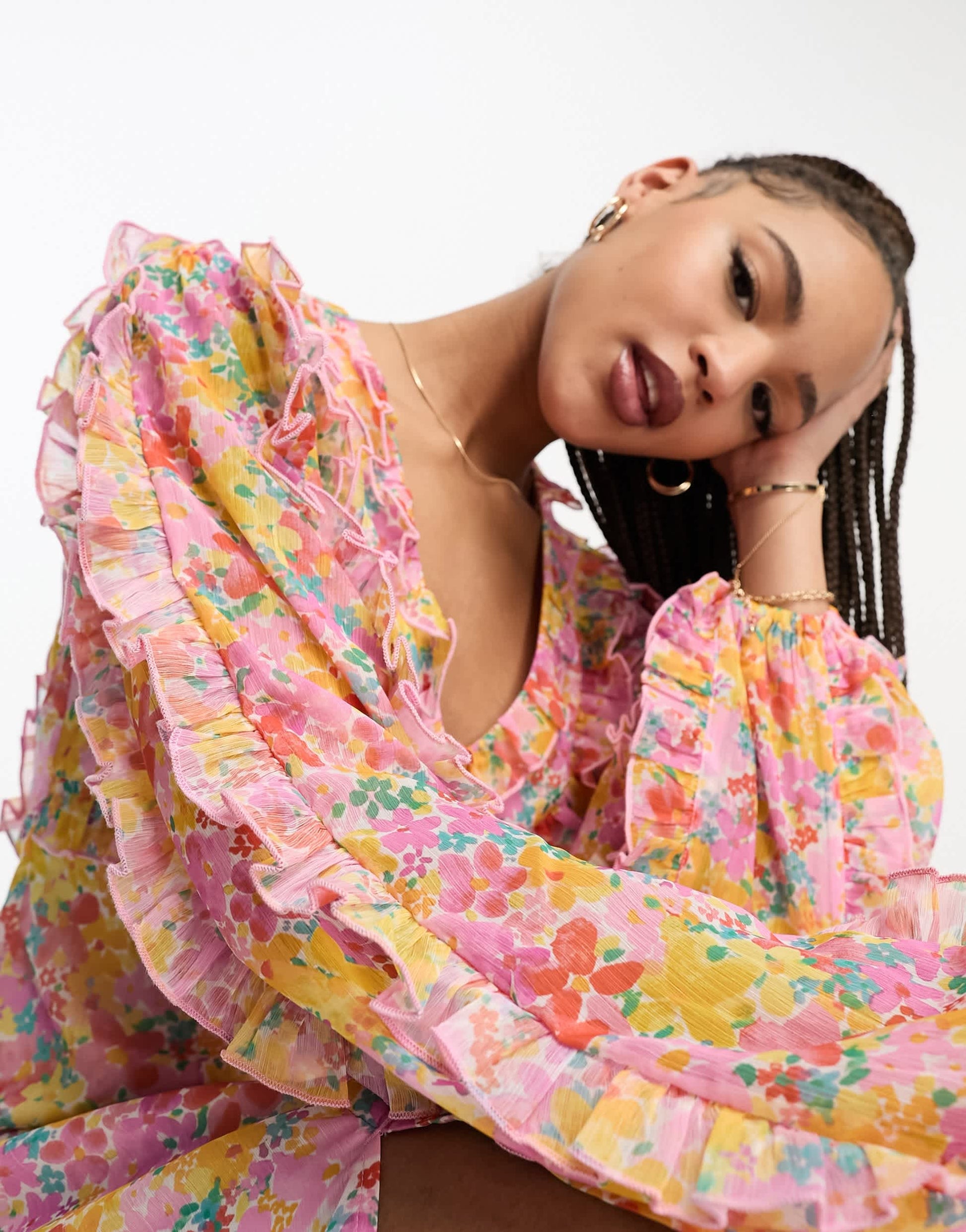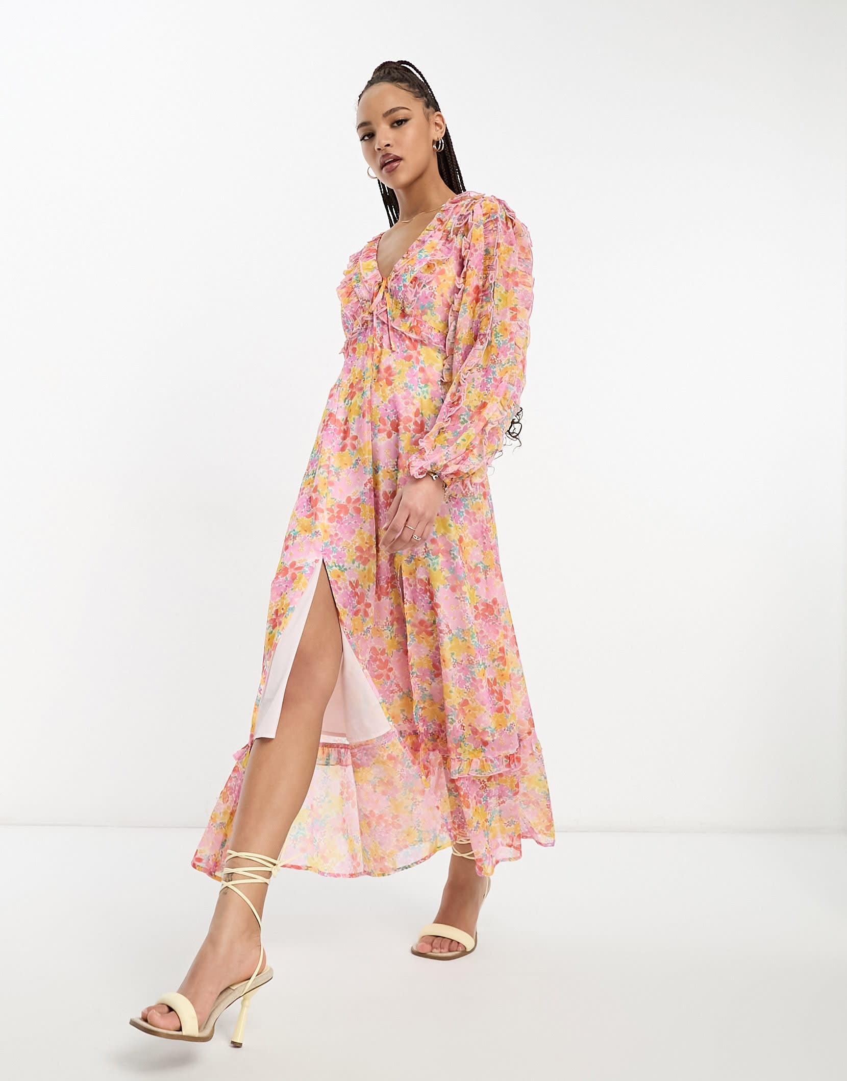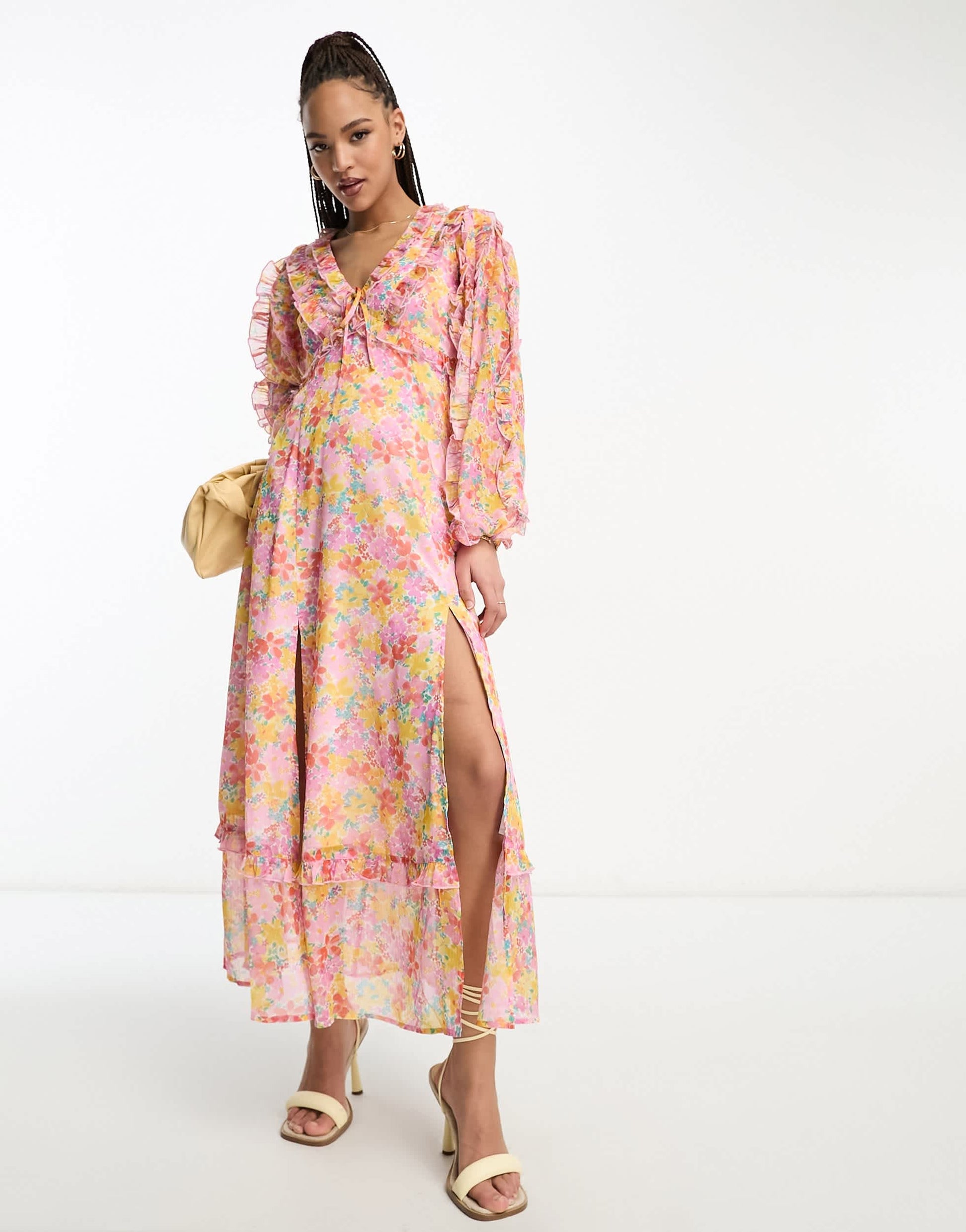 Miss Selfridge chiffon frill detail maxi dress in bright ditsy floral