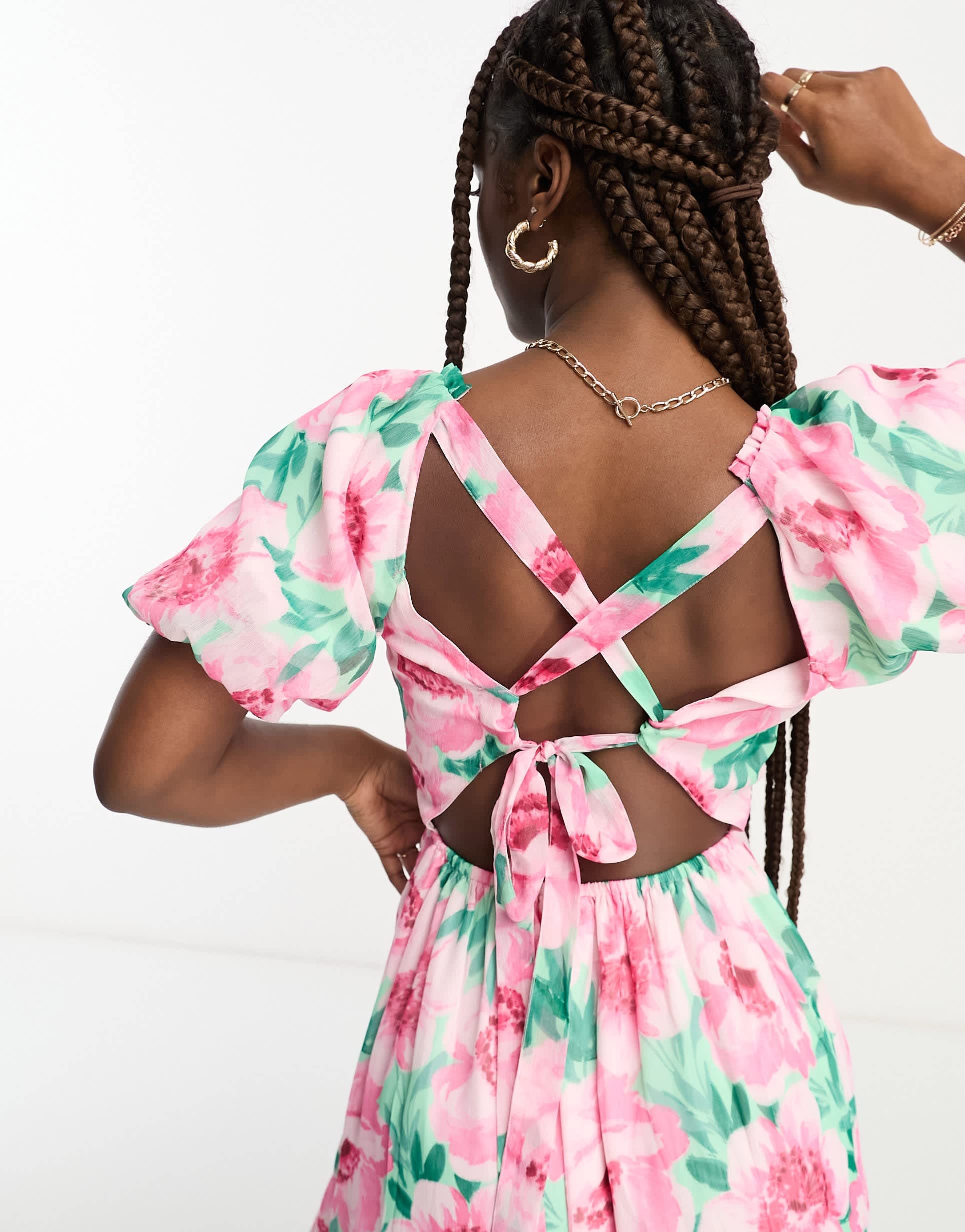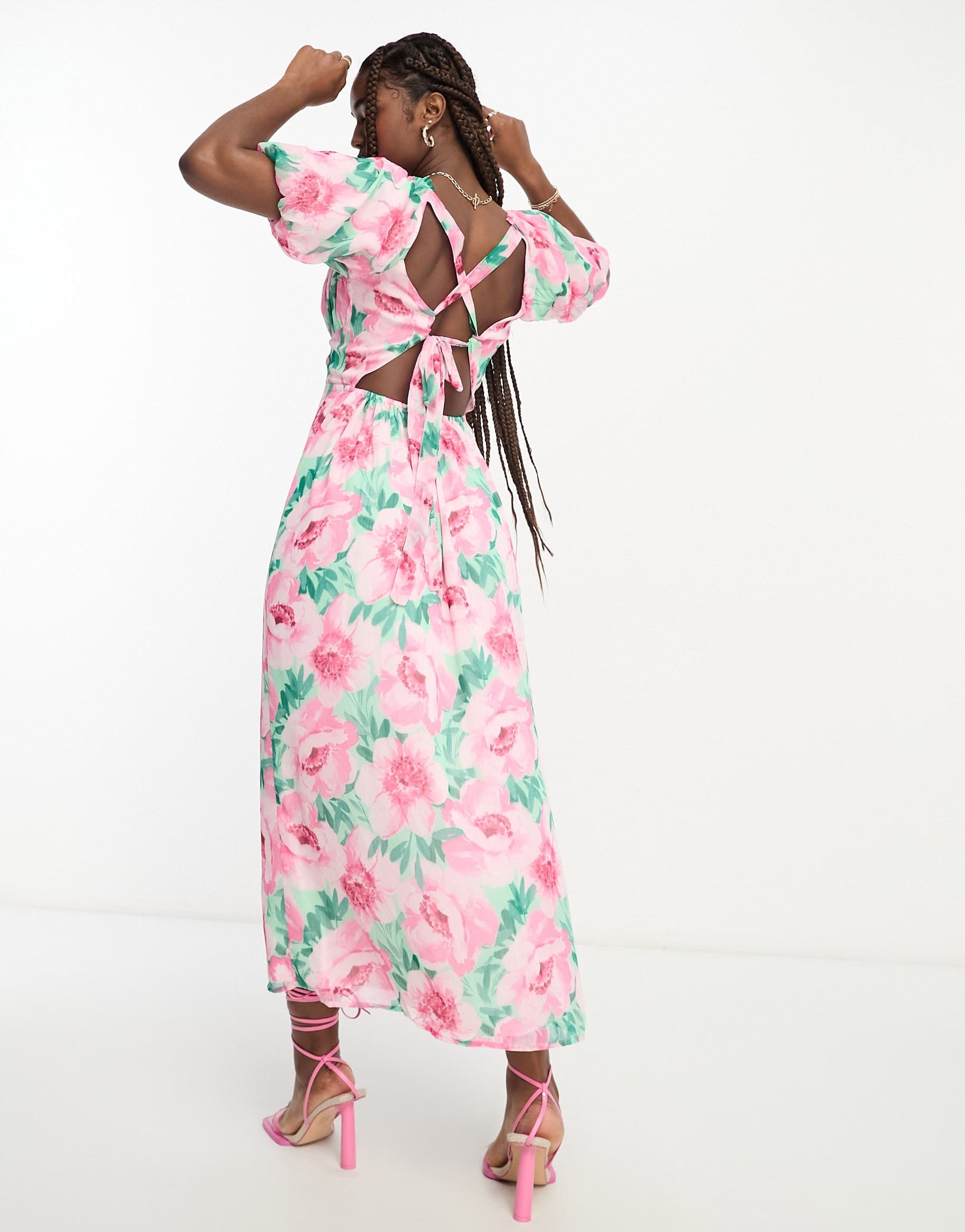 Miss Selfridge chiffon puff sleeve maxi dress with back detail in pink floral