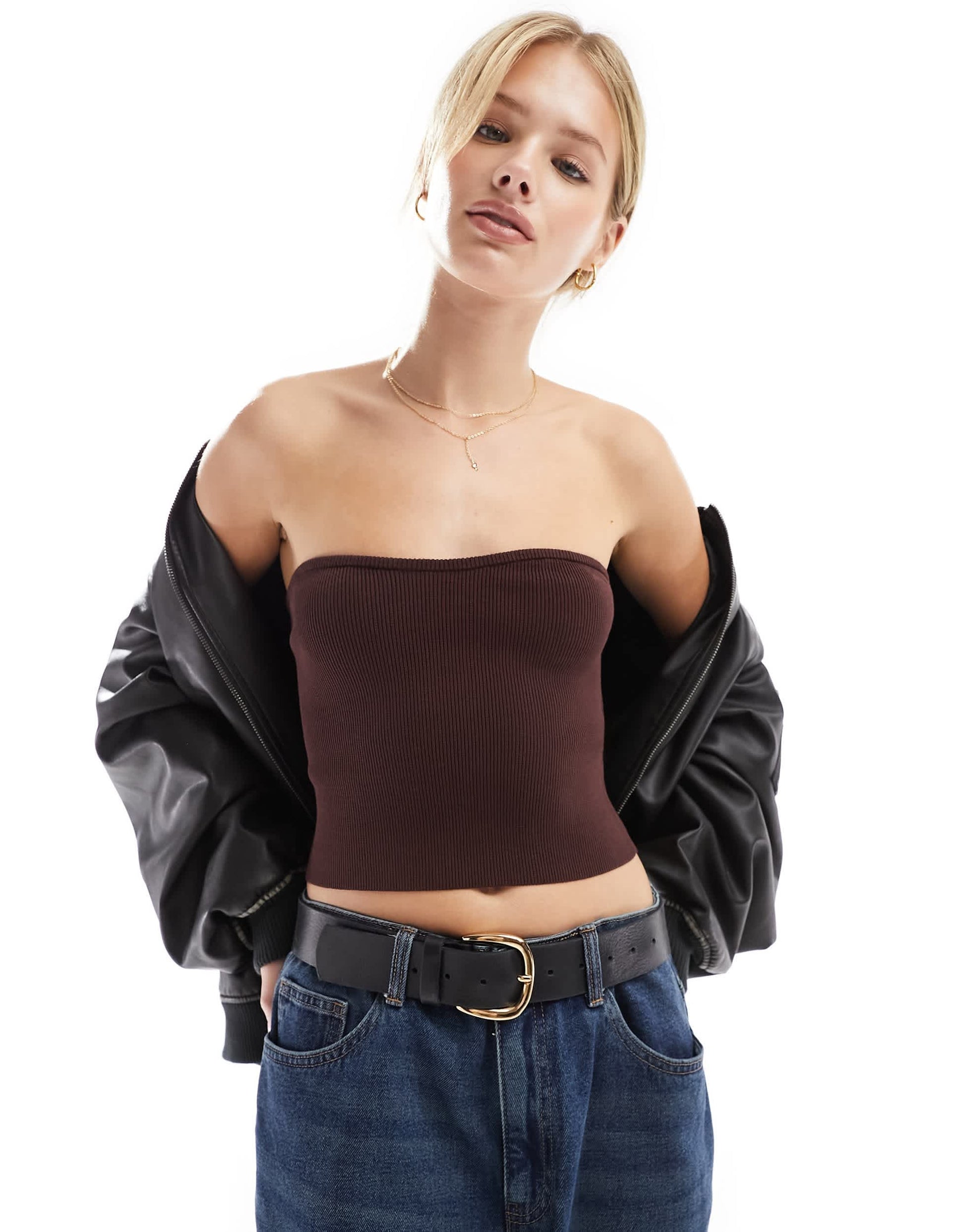 Miss Selfridge compact knit rib bandeau top in chocolate