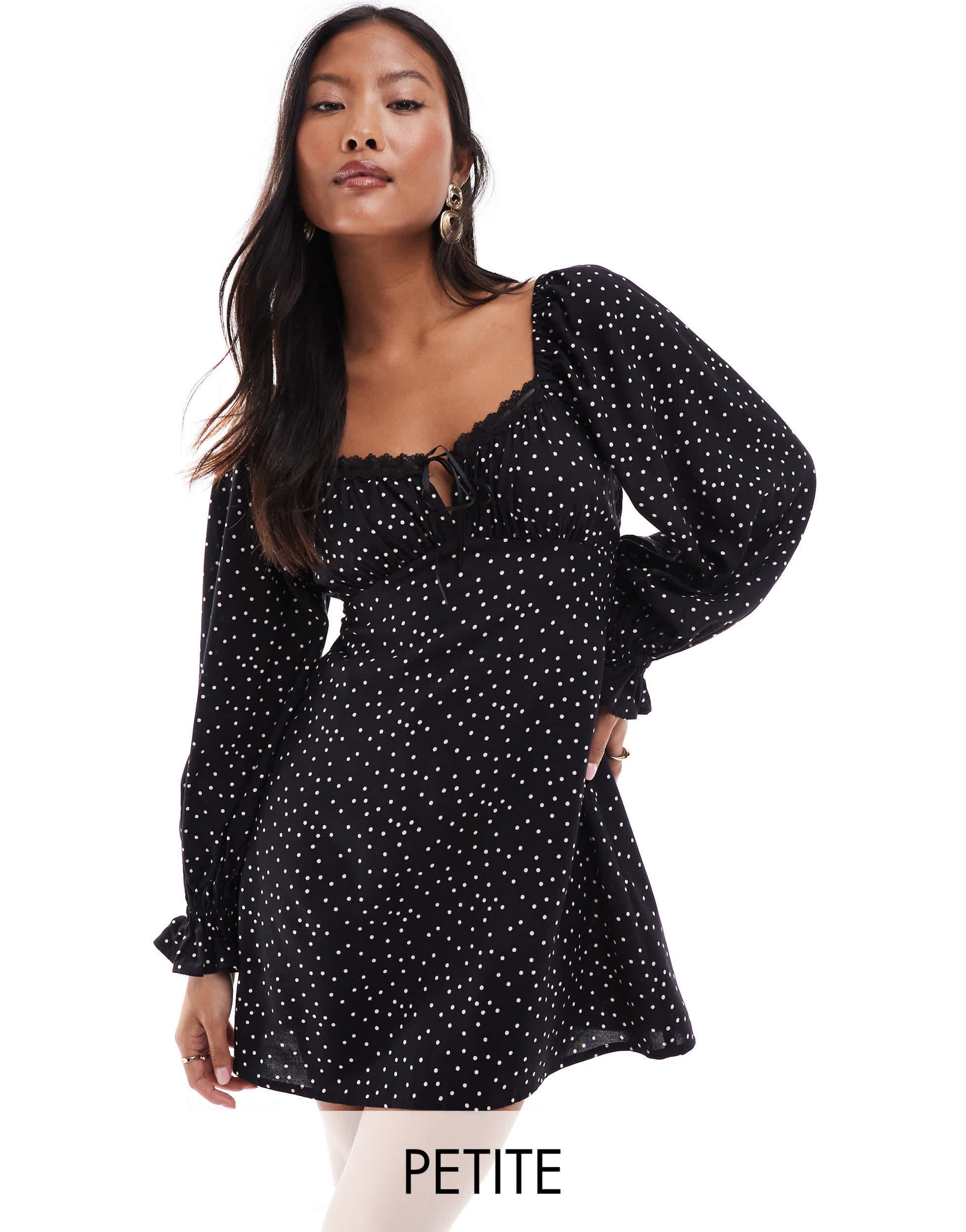 Miss Selfridge Petite ribbon detail tie front mini tea dress in polka dot