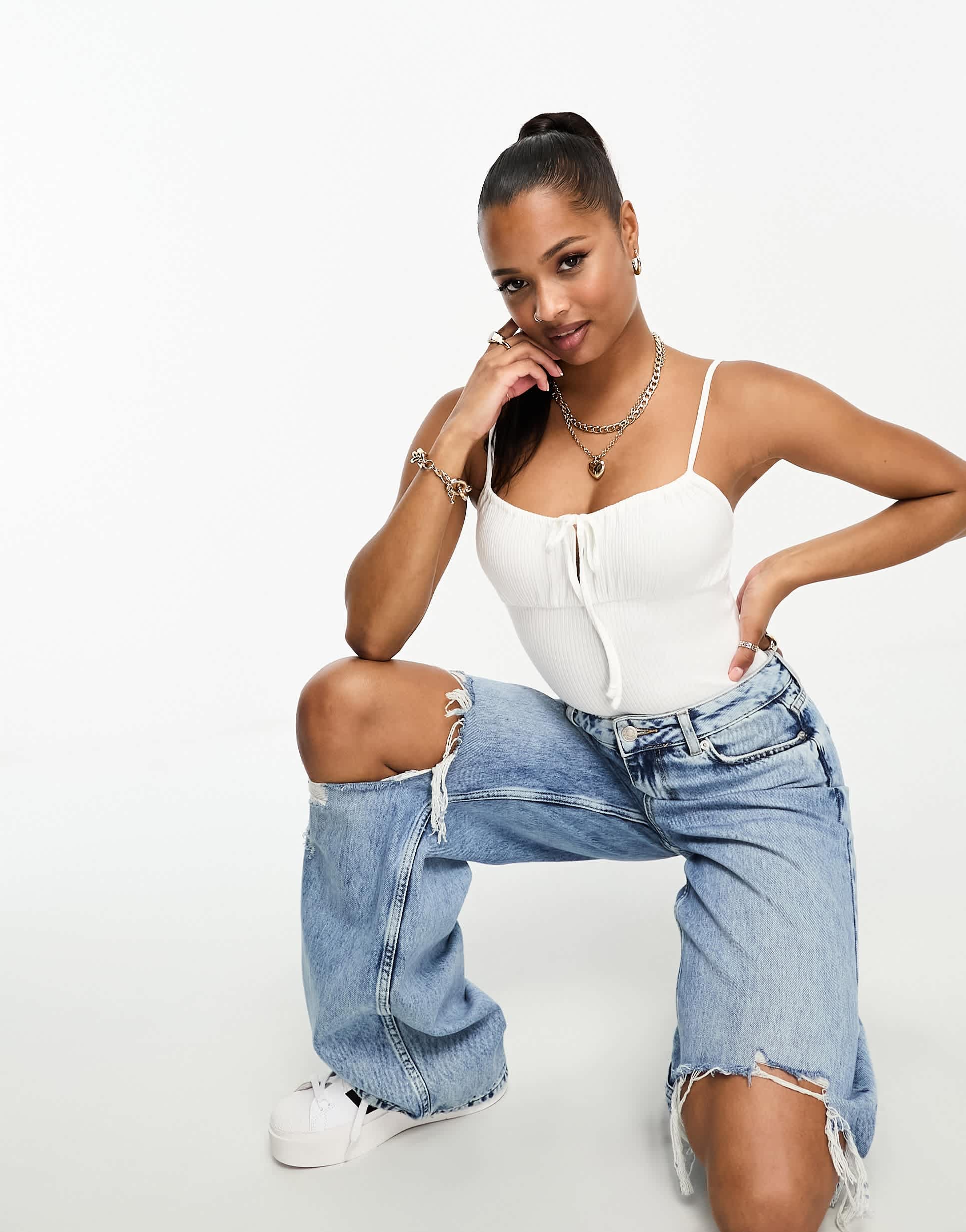 Miss Selfridge Petite tie strappy rib bodysuit in white
