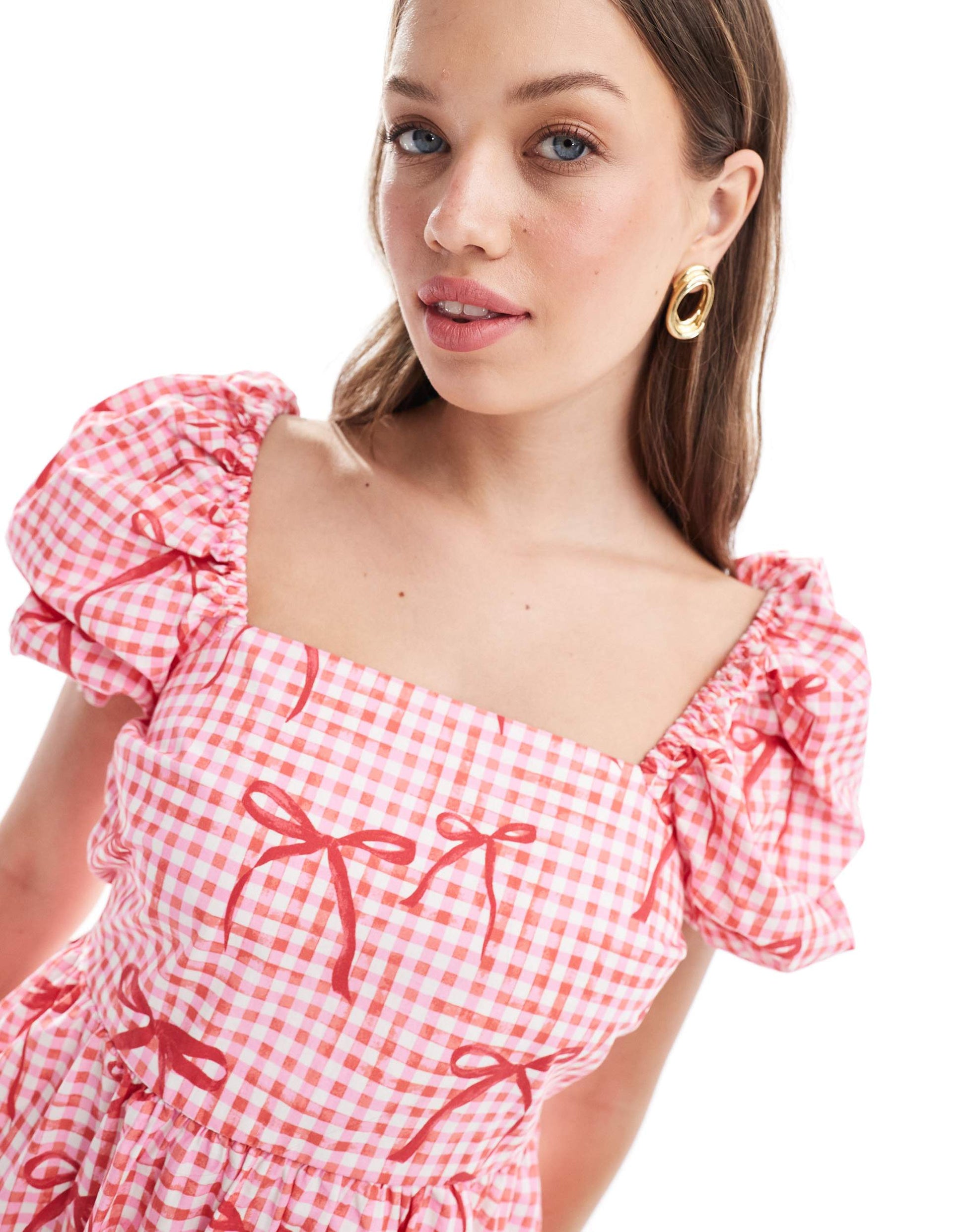 Miss Selfridge poplin tiered mini smock dress in pink gingham bow print