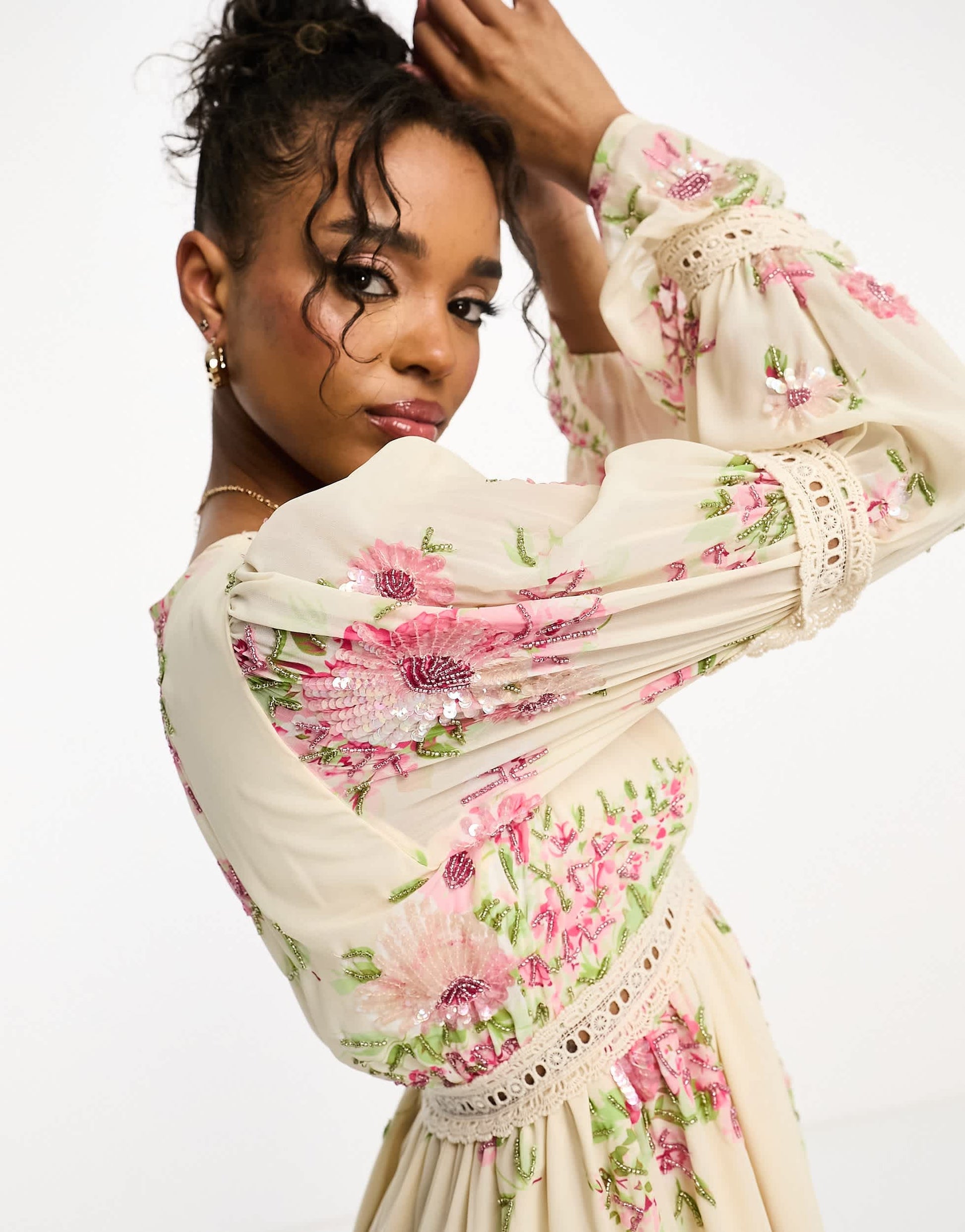 Miss Selfridge Premium embellished festival playsuit with lace insert in floral print