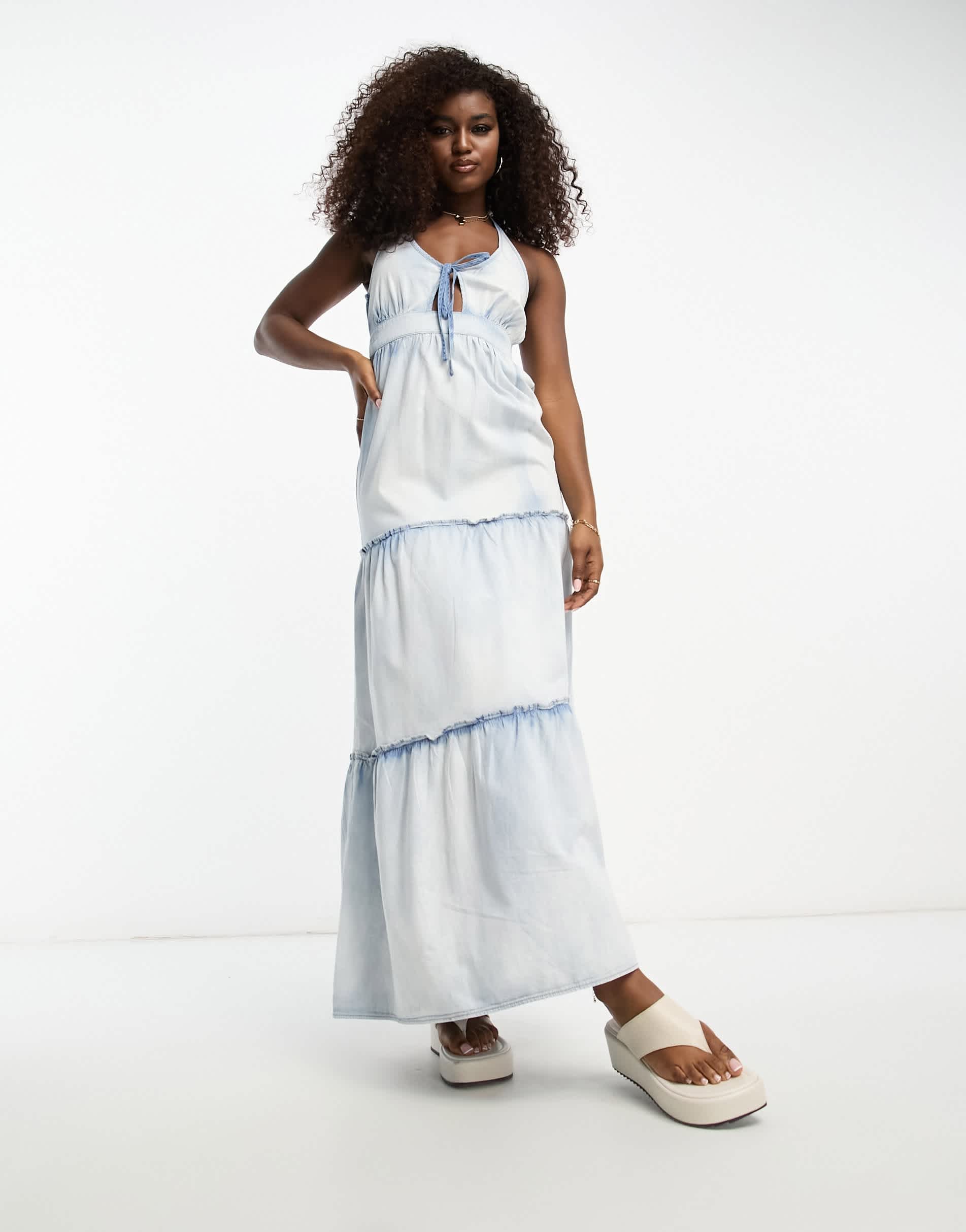 Miss Selfridge tiered denim maxi dress in mid wash