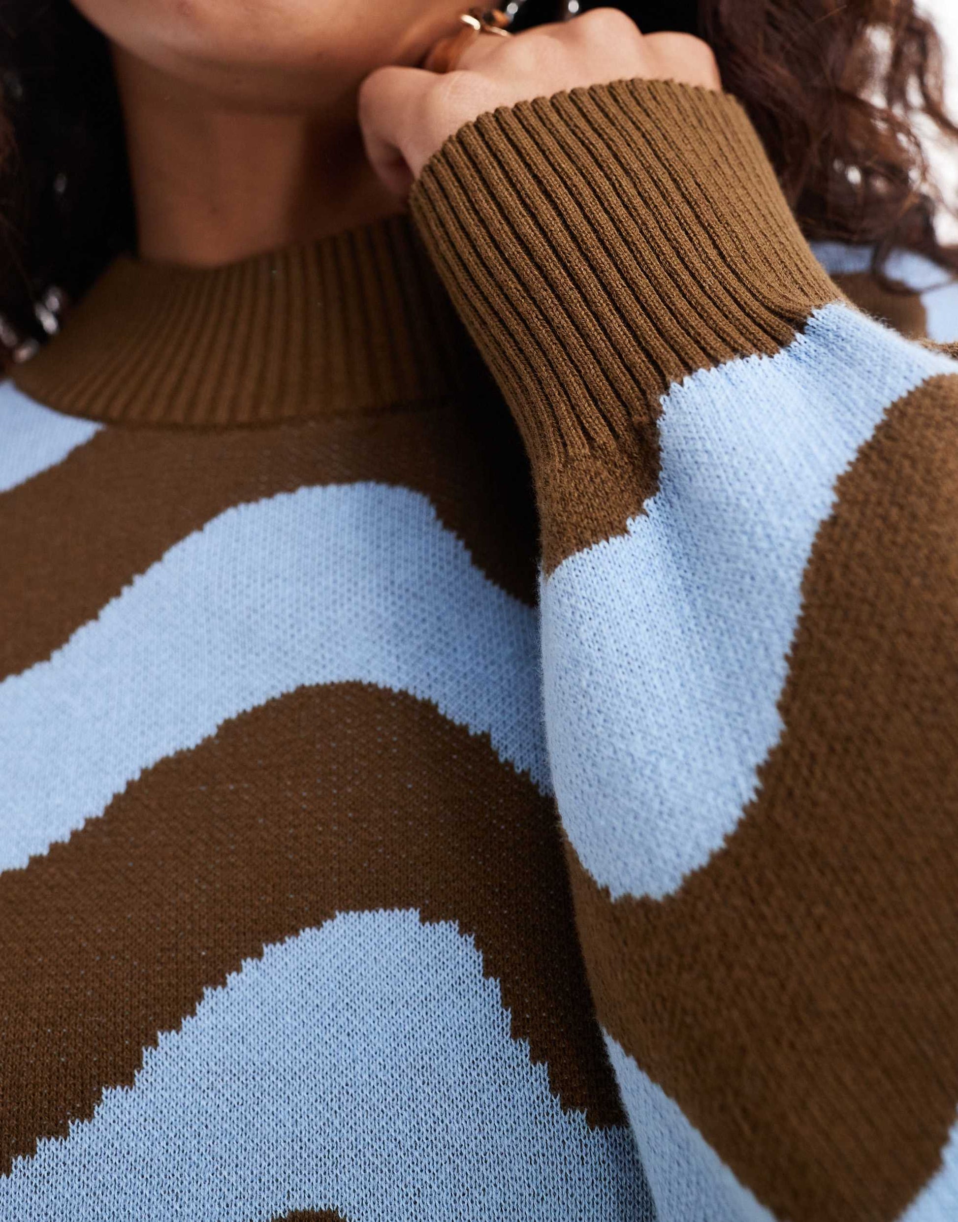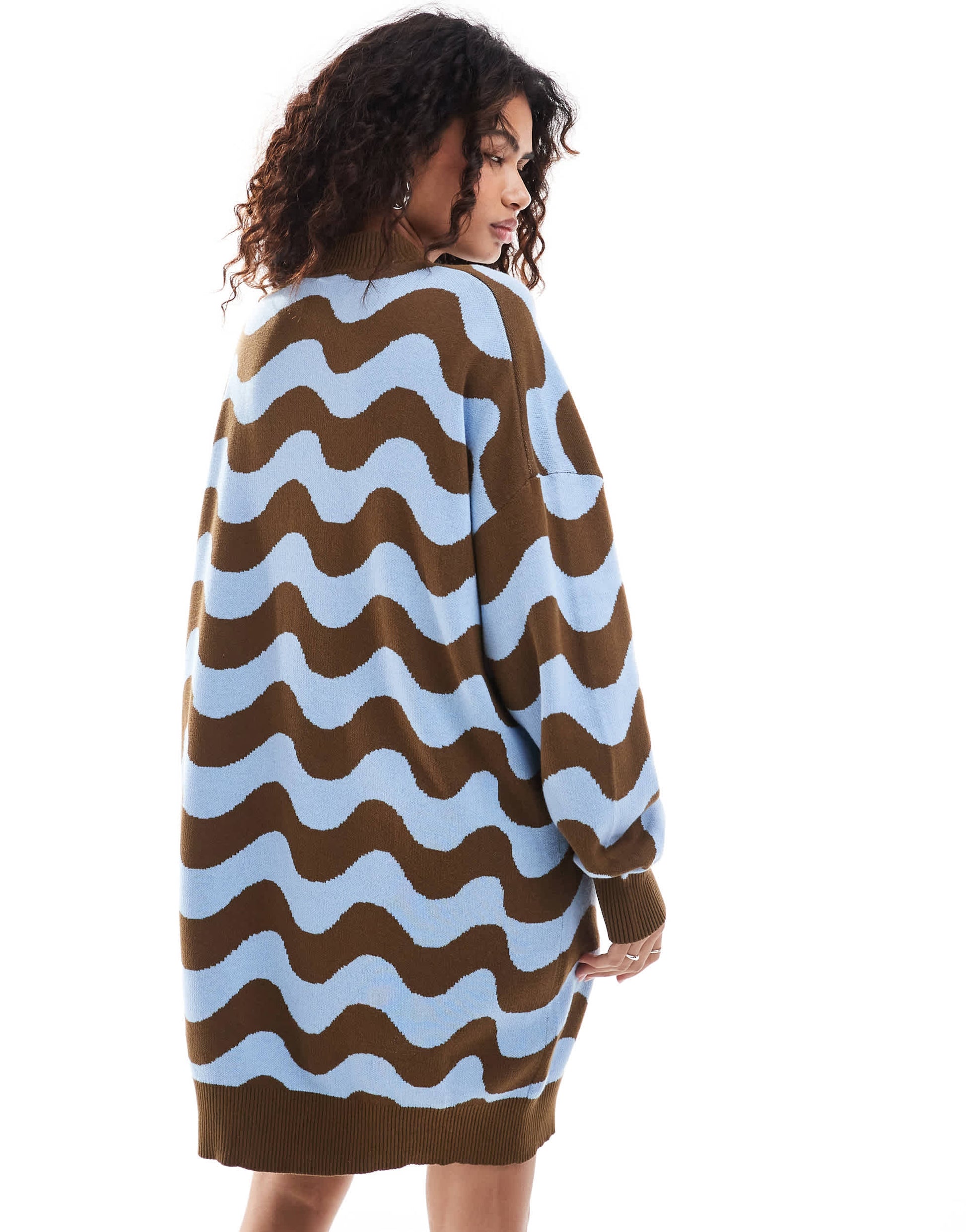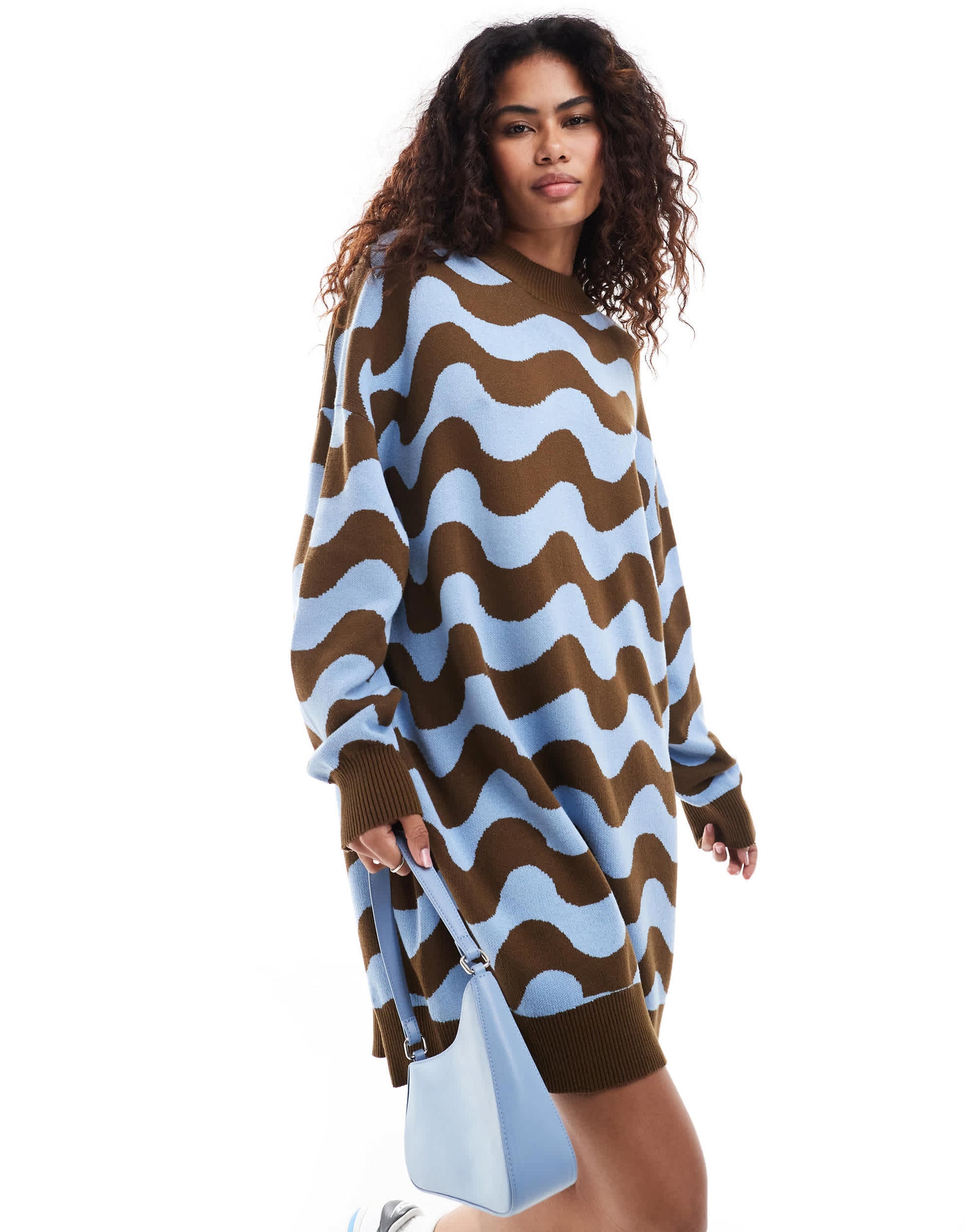 Monki oversized knitted mini dress in brown and blue wave pattern jacquard