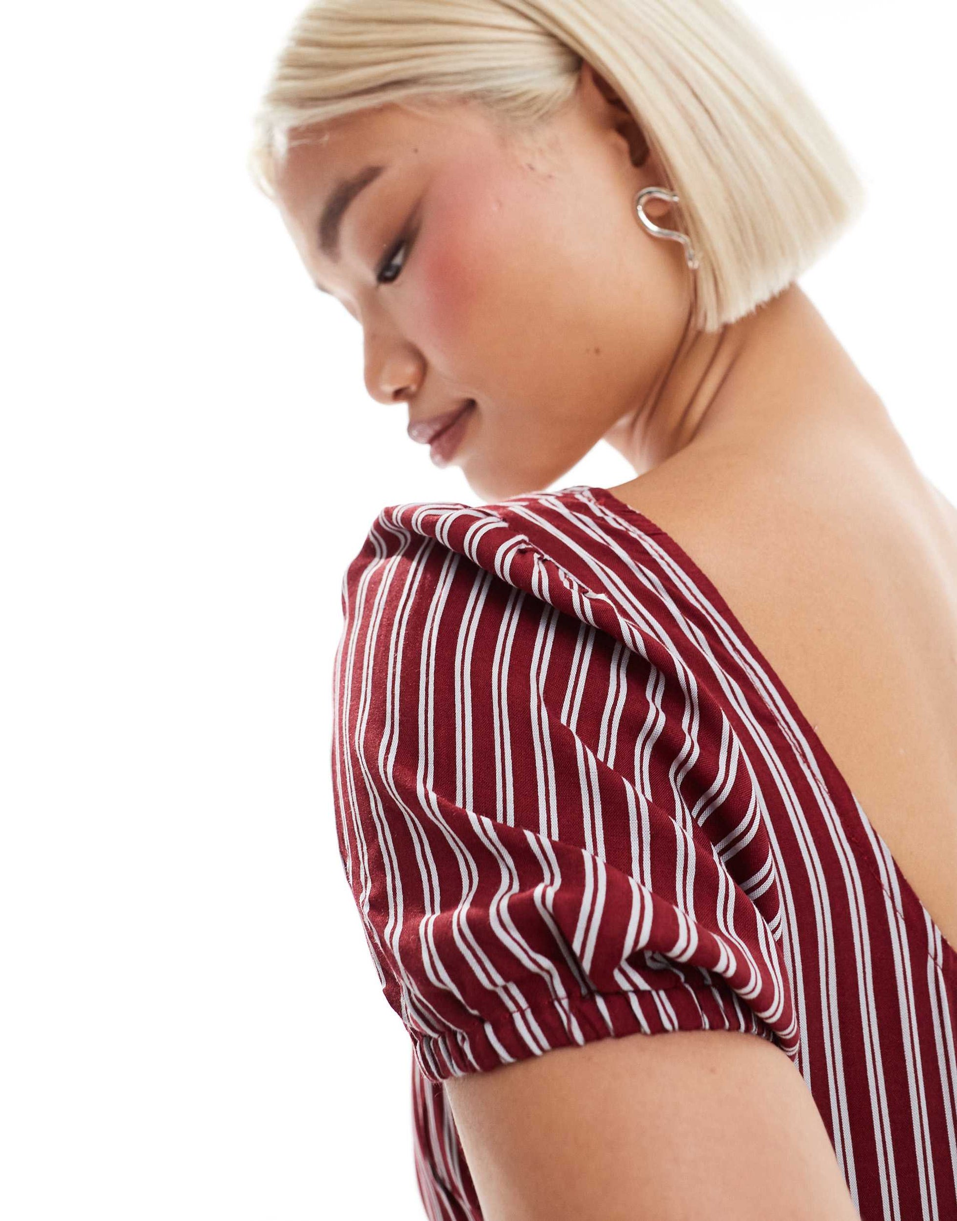 Motel Exclusive jemima puff sleeve striped mini dress in burgundy and blue