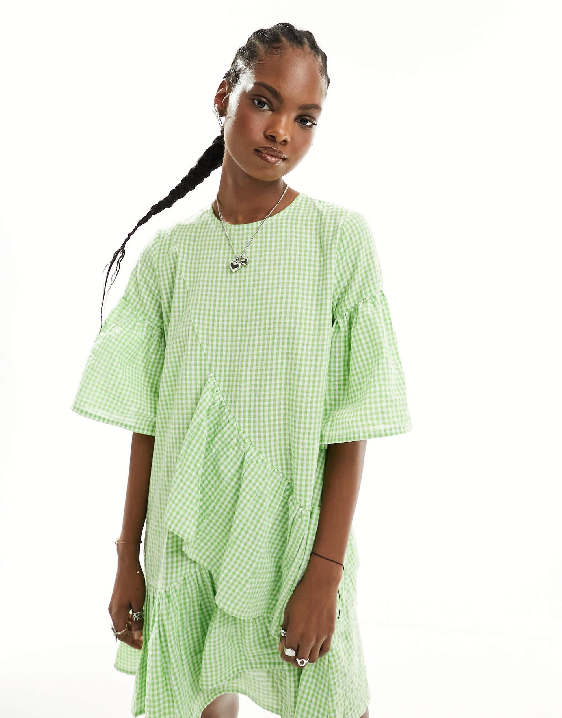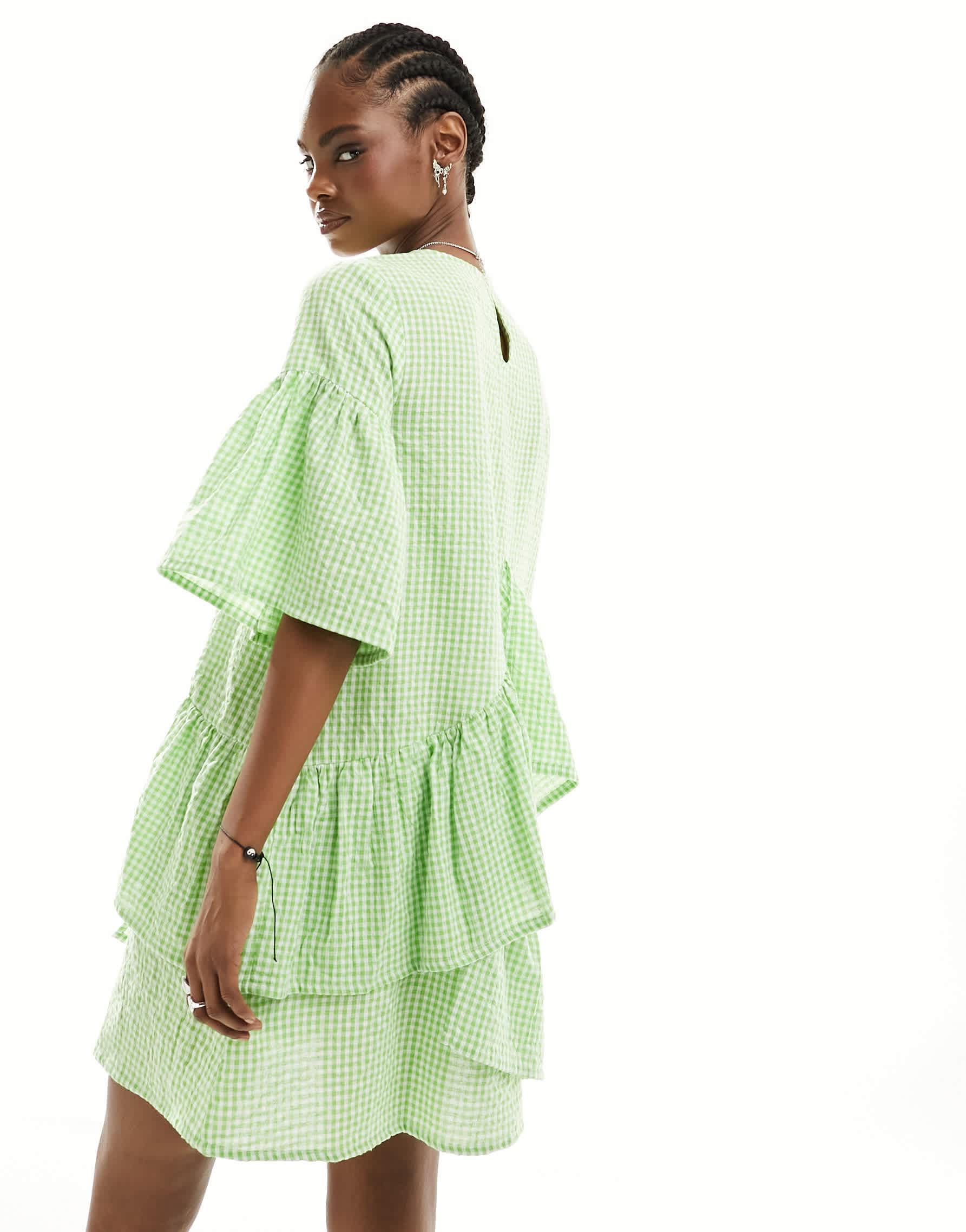 Native Youth ruffle detail gingham mini smock dress in green