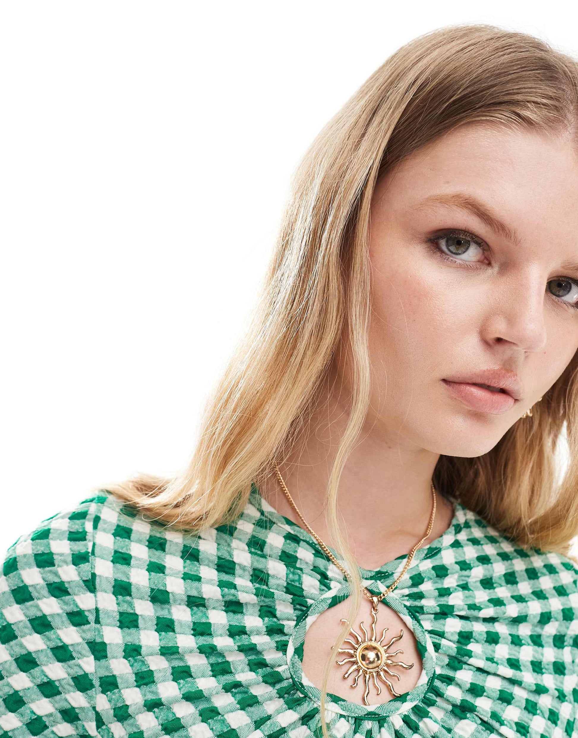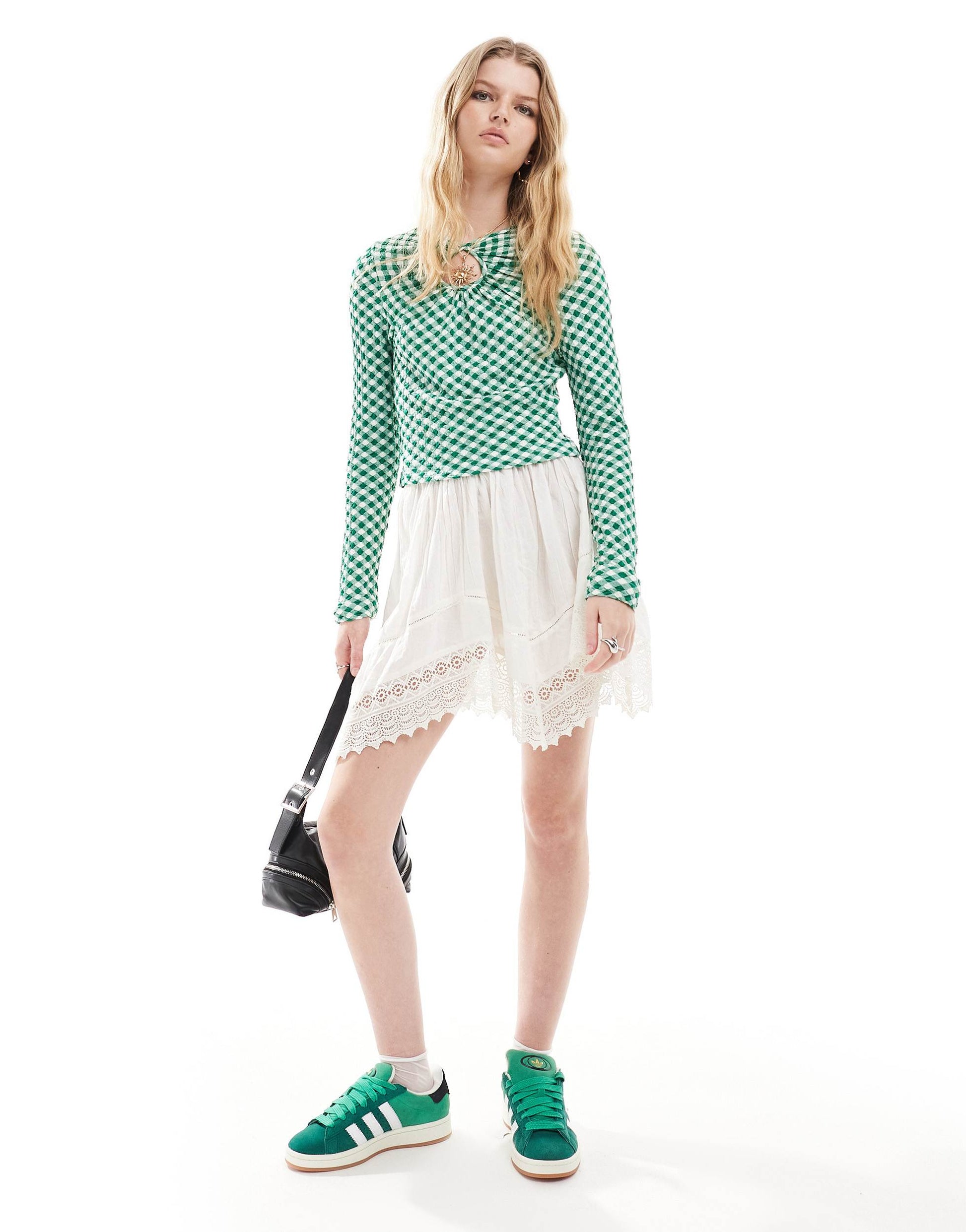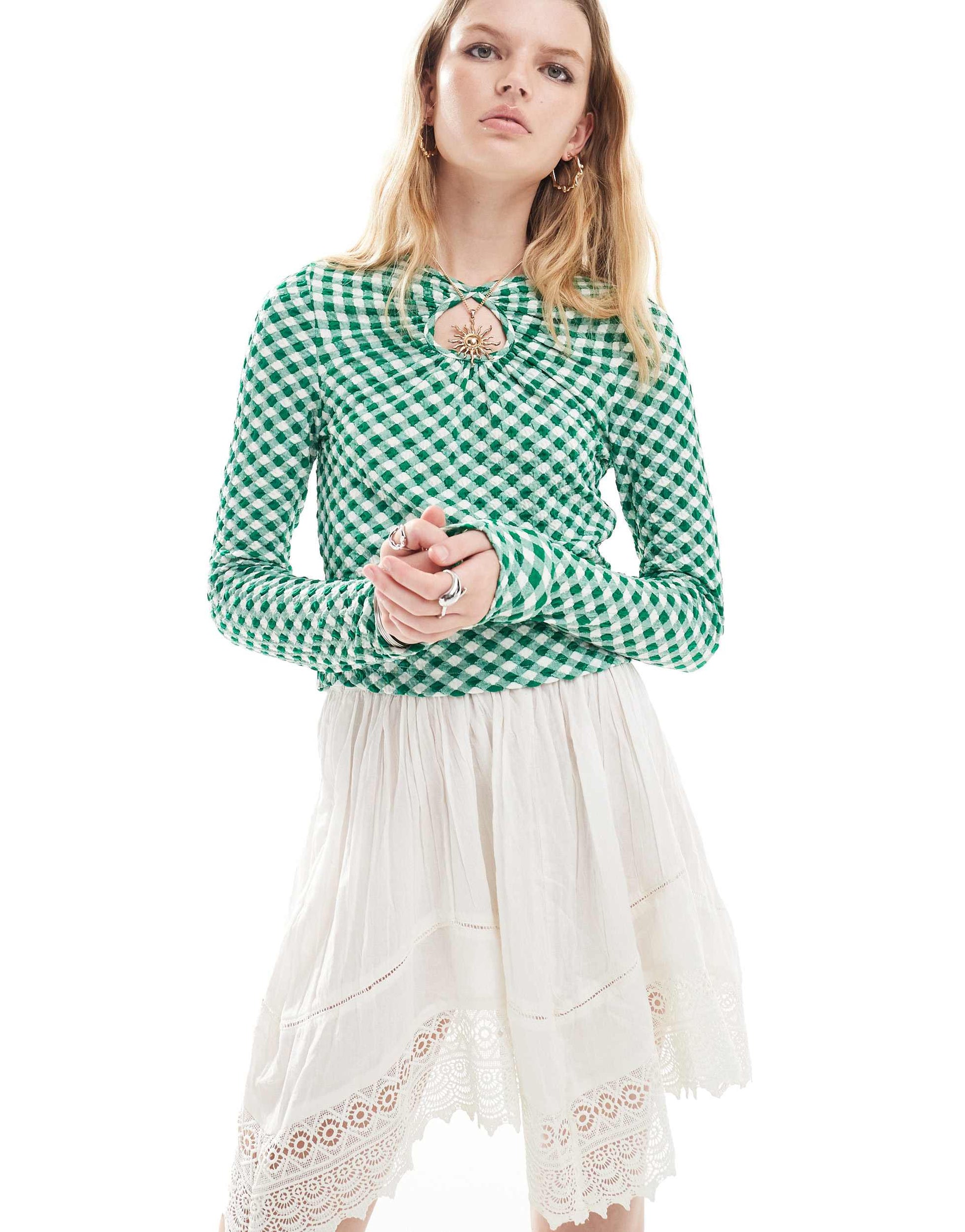 Neon Rose slinky gingham long sleeve keyhole top in green