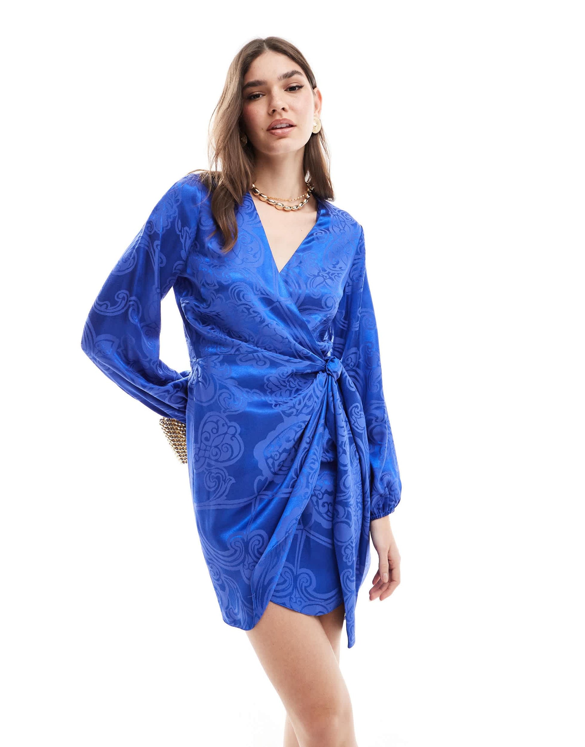 Never Fully Dressed Vienna satin jacquard wrap mini dress in cobalt