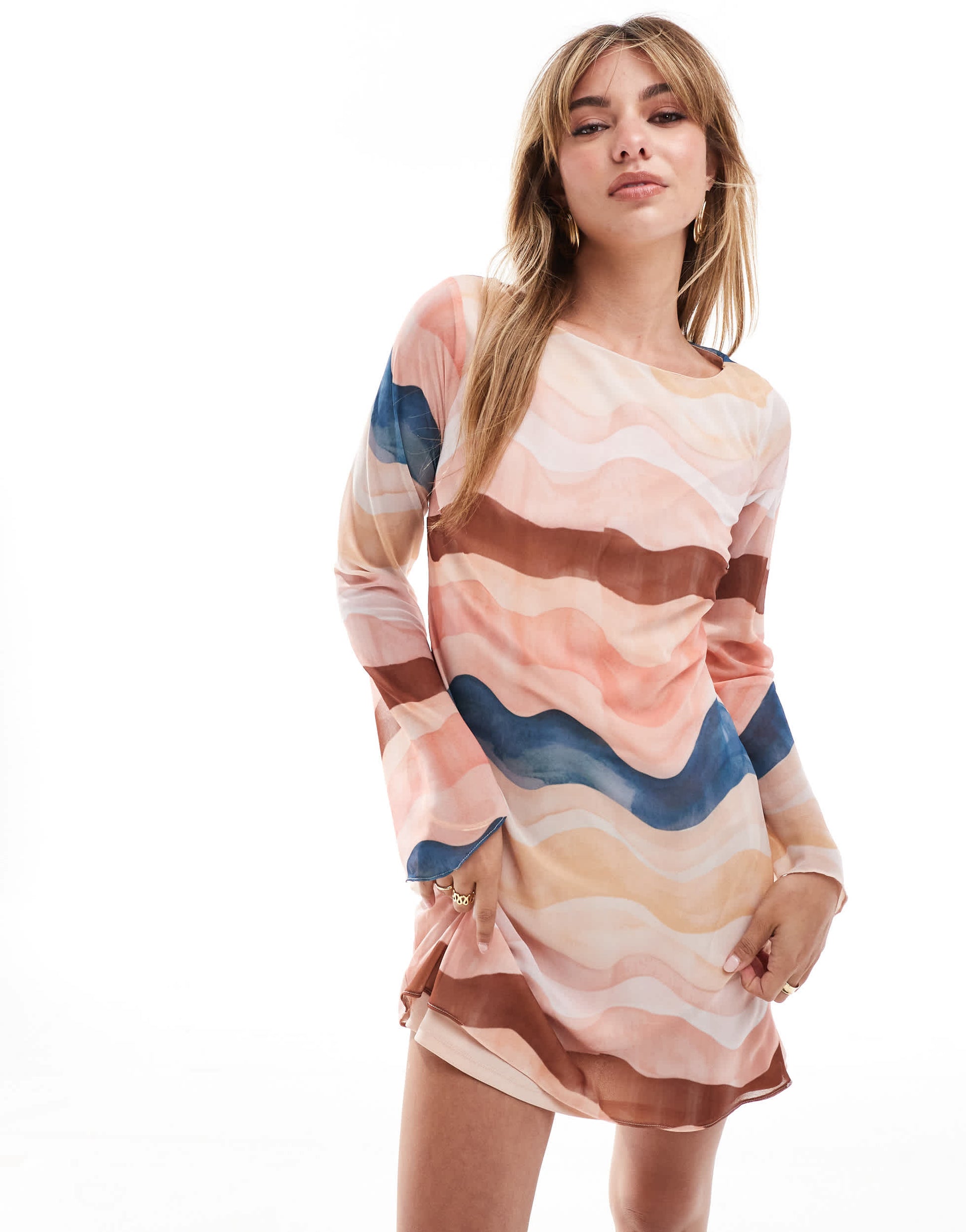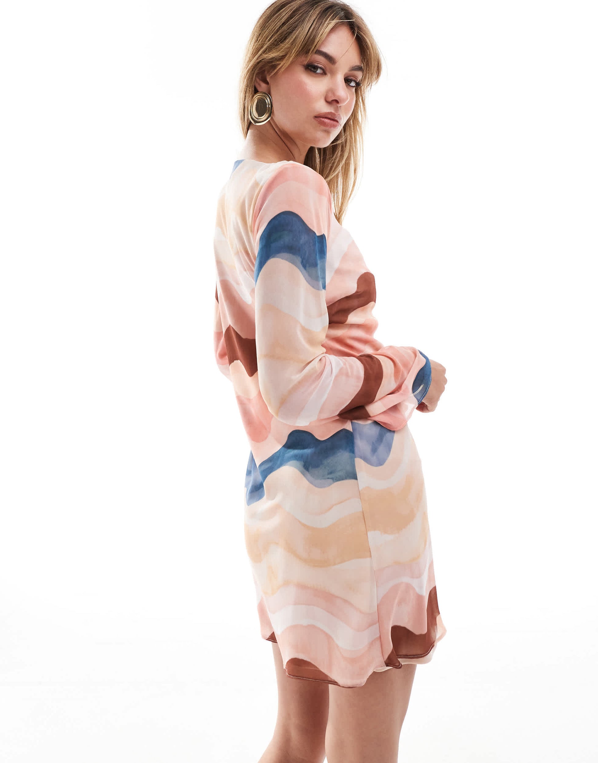 New Look wavy chiffon long sleeve midi dress in multi colour