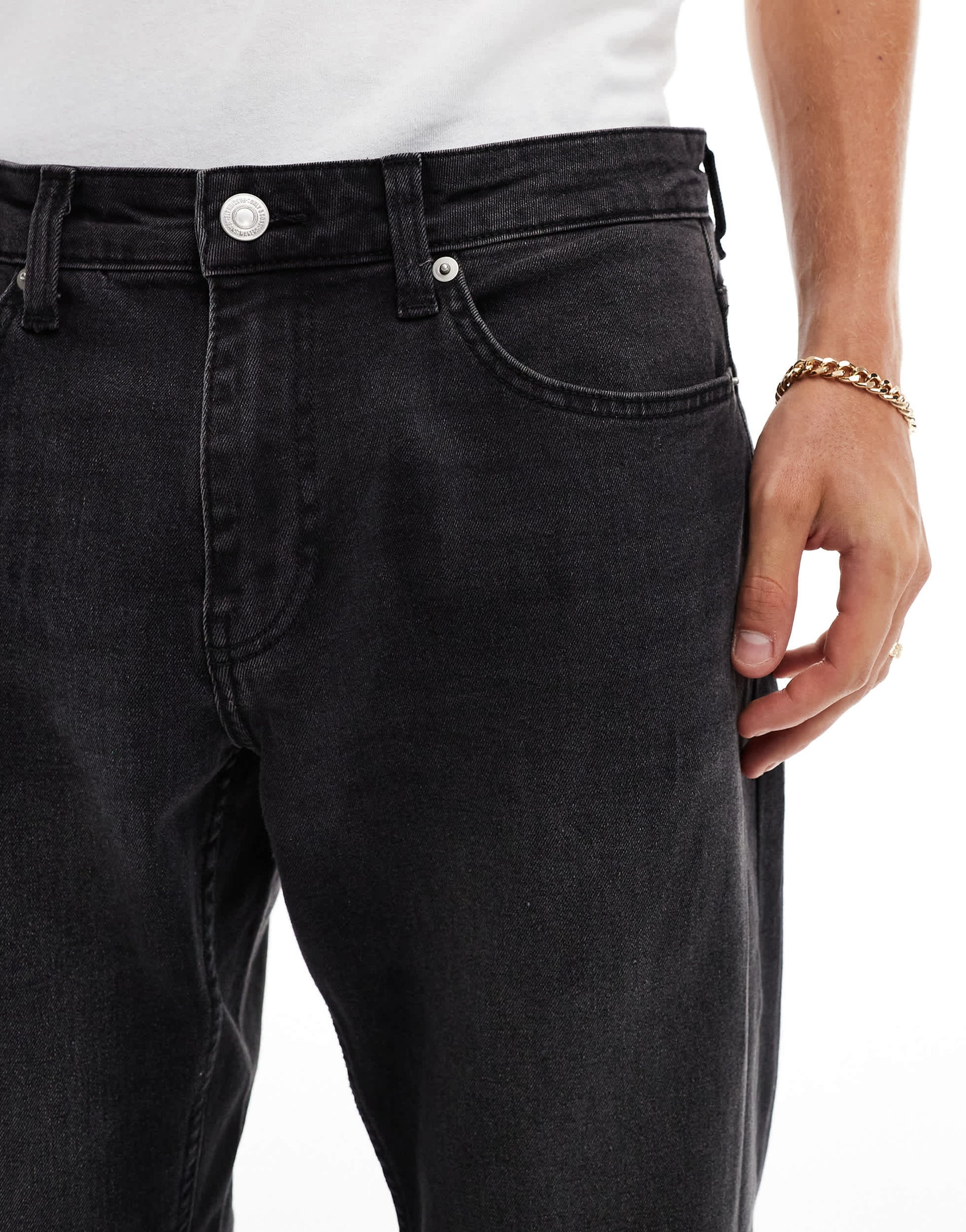 Non-stretch denim: black wash Main: 68% Cotton, 26% Polyester, 4% Viscose, 2% Elastane.