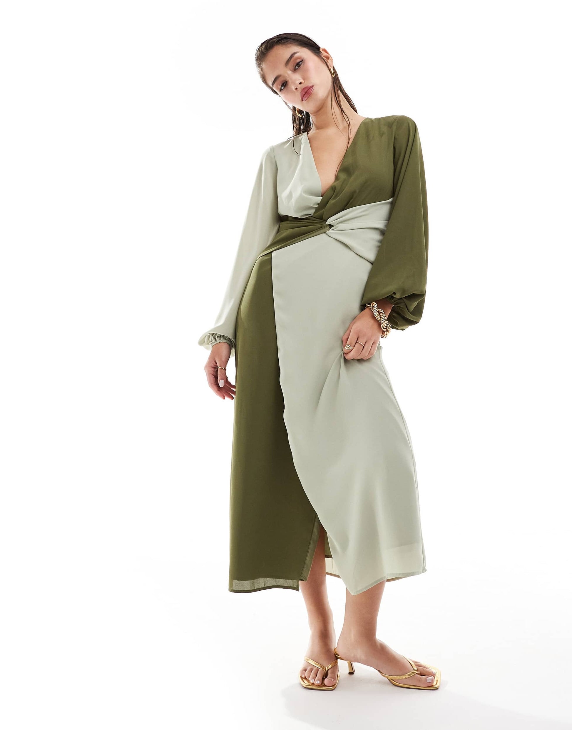Pretty Lavish knot front contrast midi dress in olive and sage