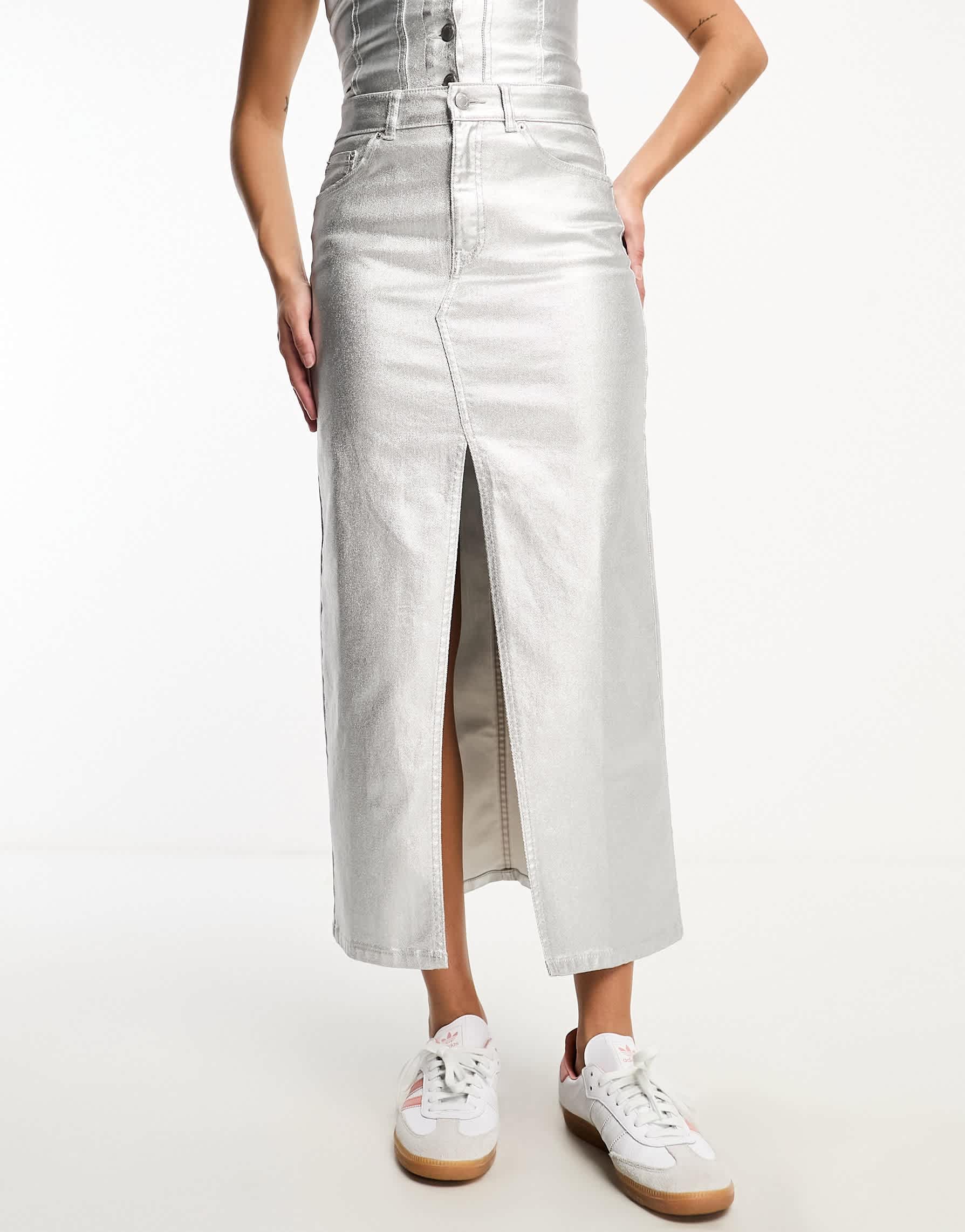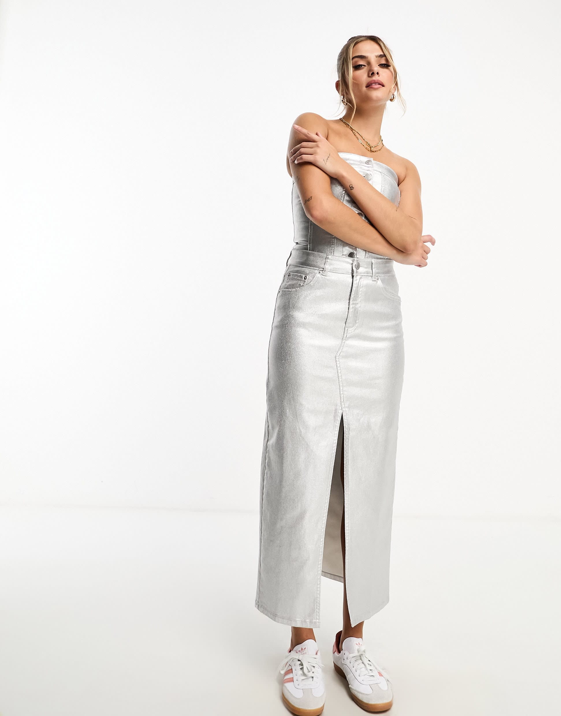 Pull&Bear metallic denim split midi skirt co-ord in silver
