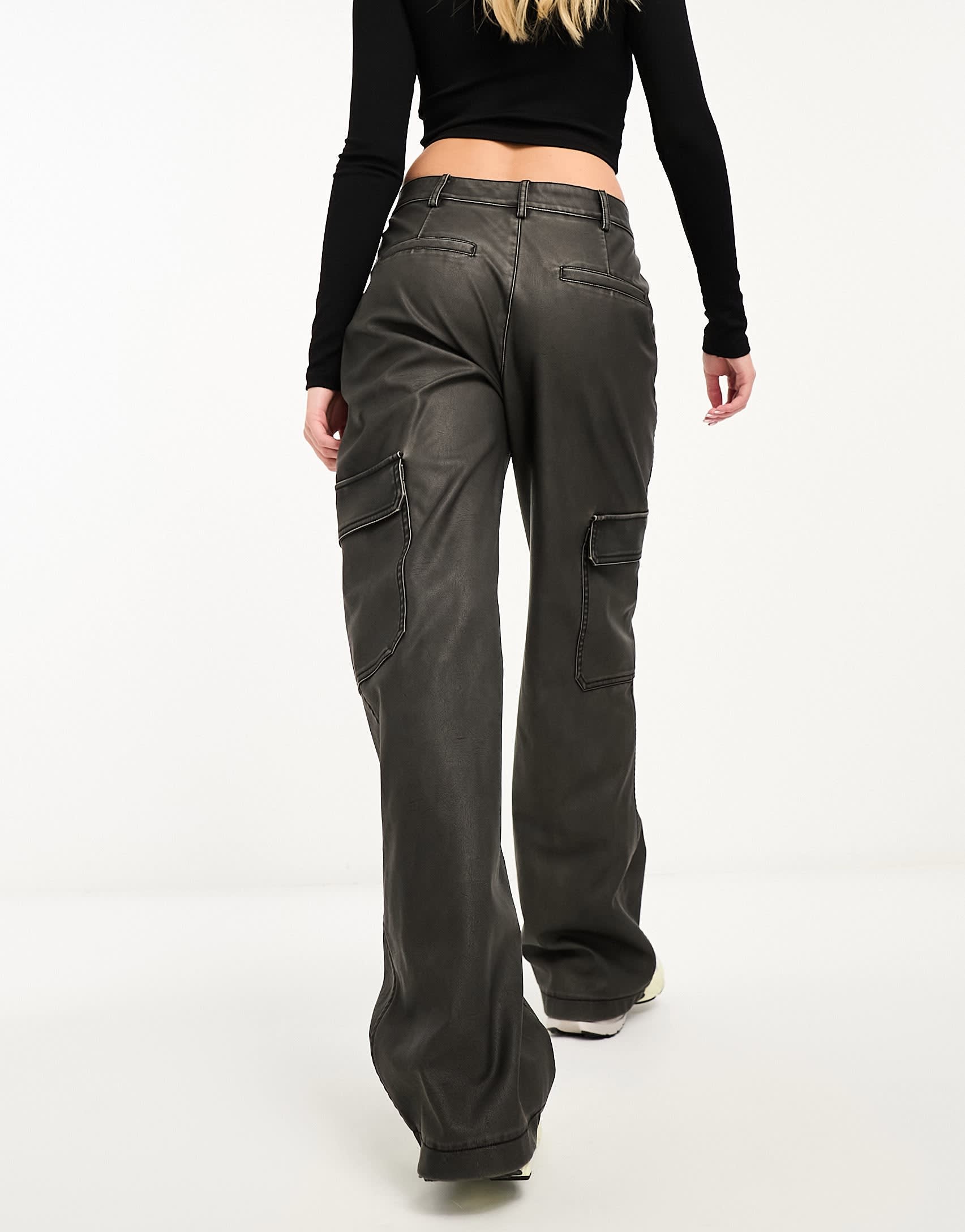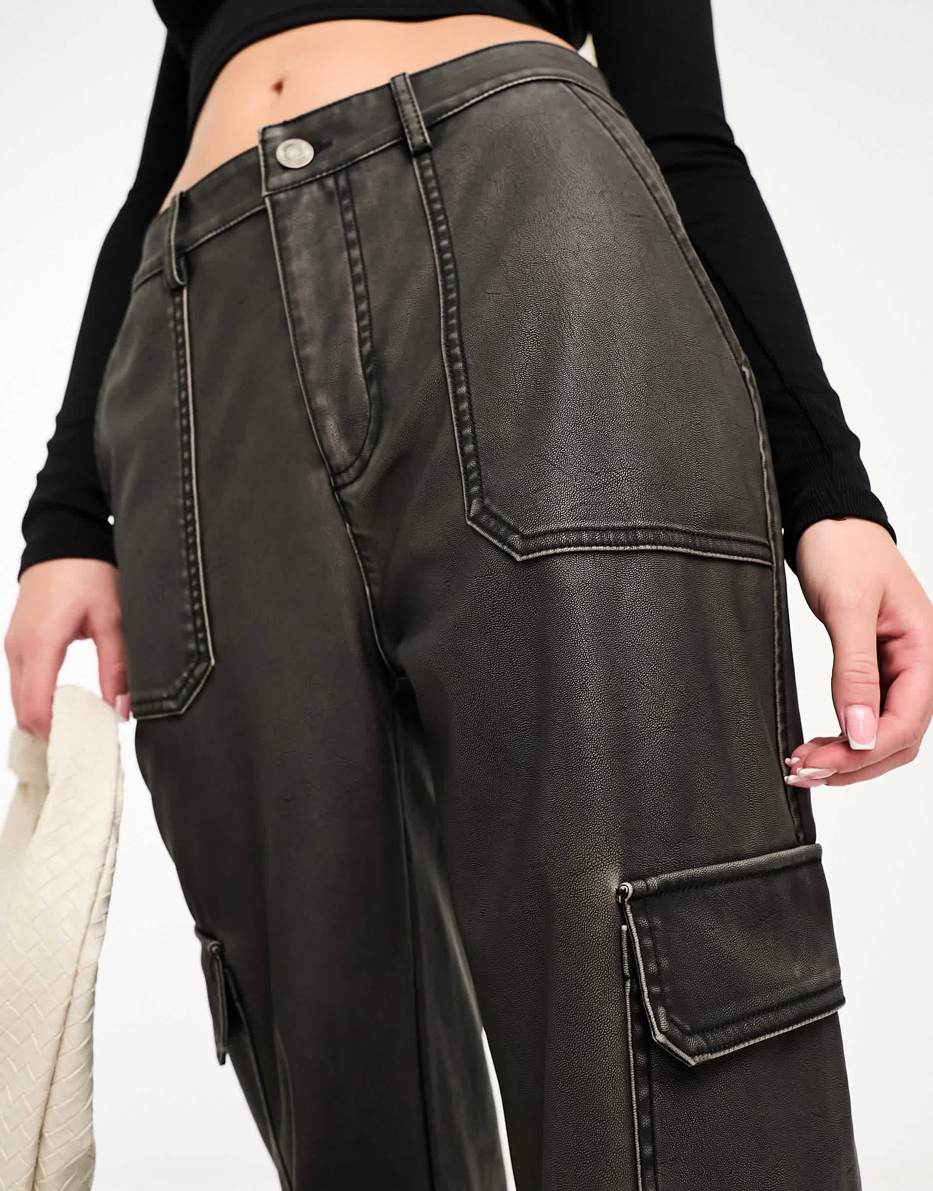 Stradivarius faux leather cargo trouser in washed black