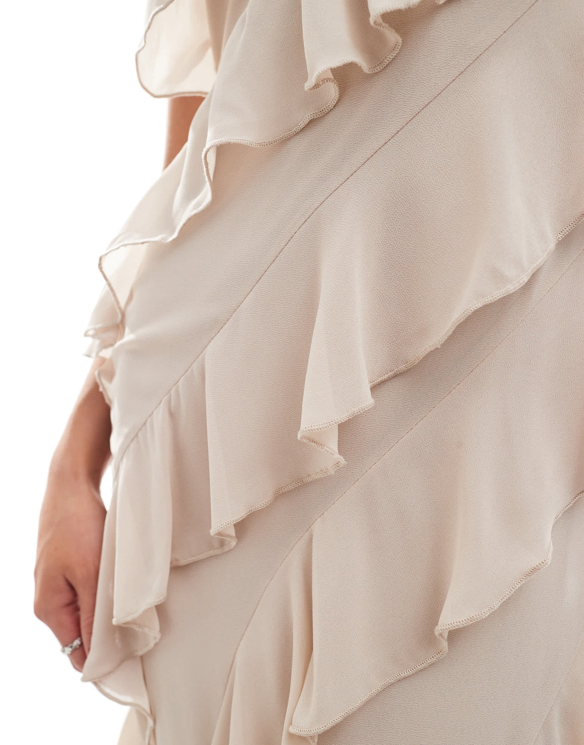 TFNC Bridesmaids Petite chiffon one shoulder maxi dress with frills in ecru