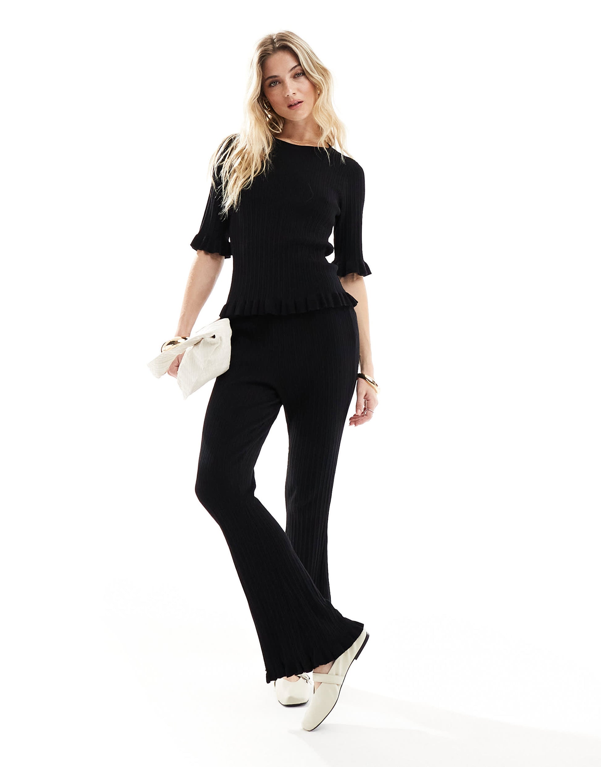 Vero Moda Aware knitted lettuce edge flared trouser co-ord in black
