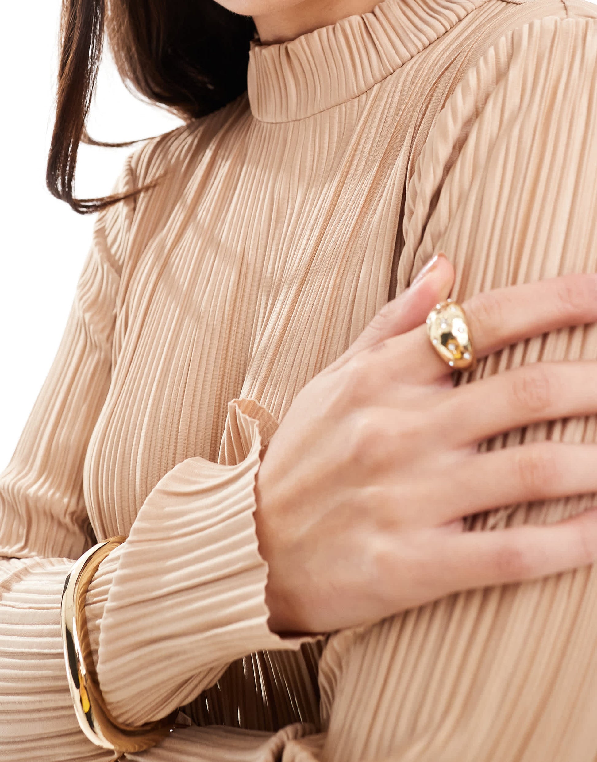Vero Moda high neck plisse mini dress in brown
