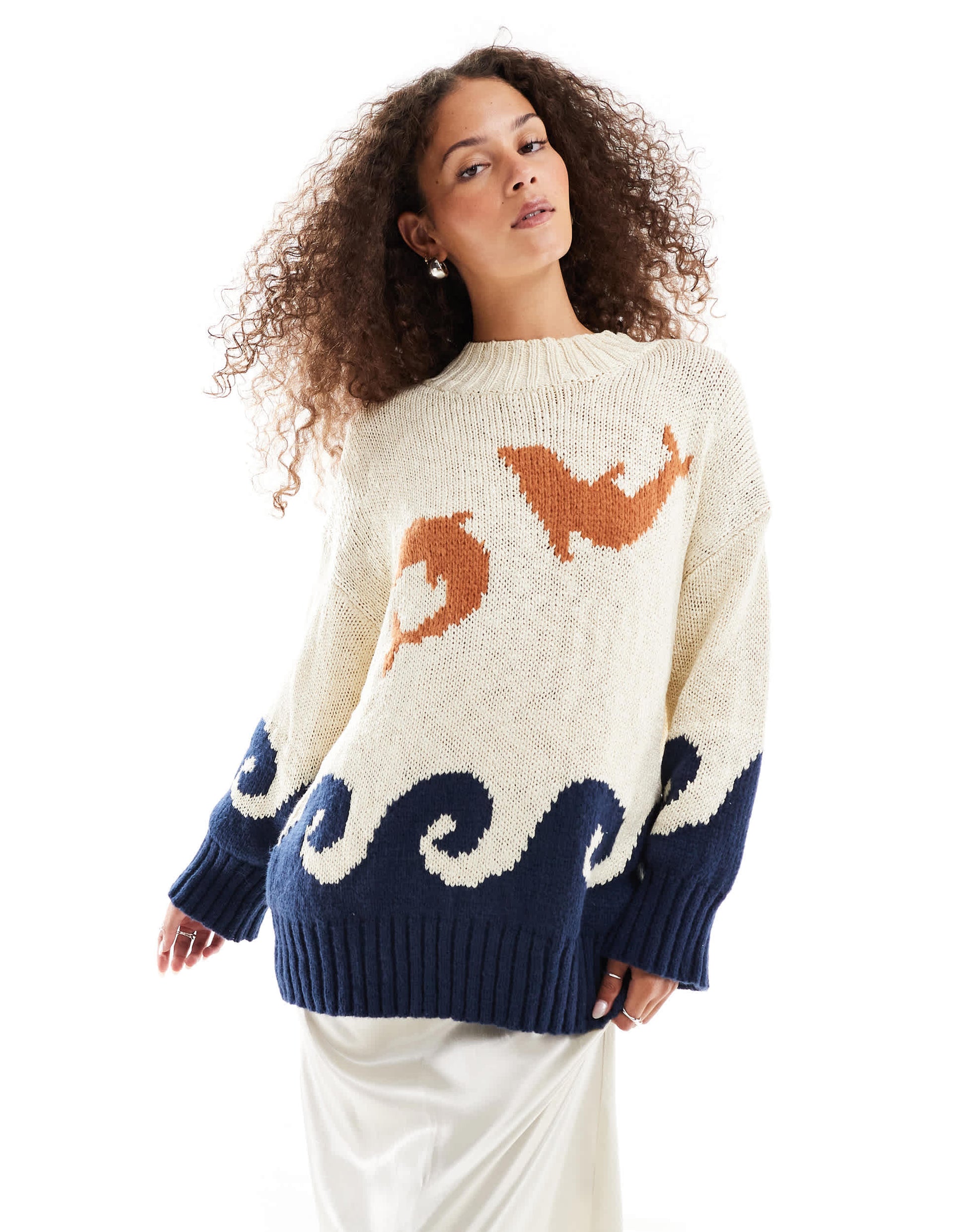 VRG GRL ace of something dolphin intarsia oversized jumper in multi